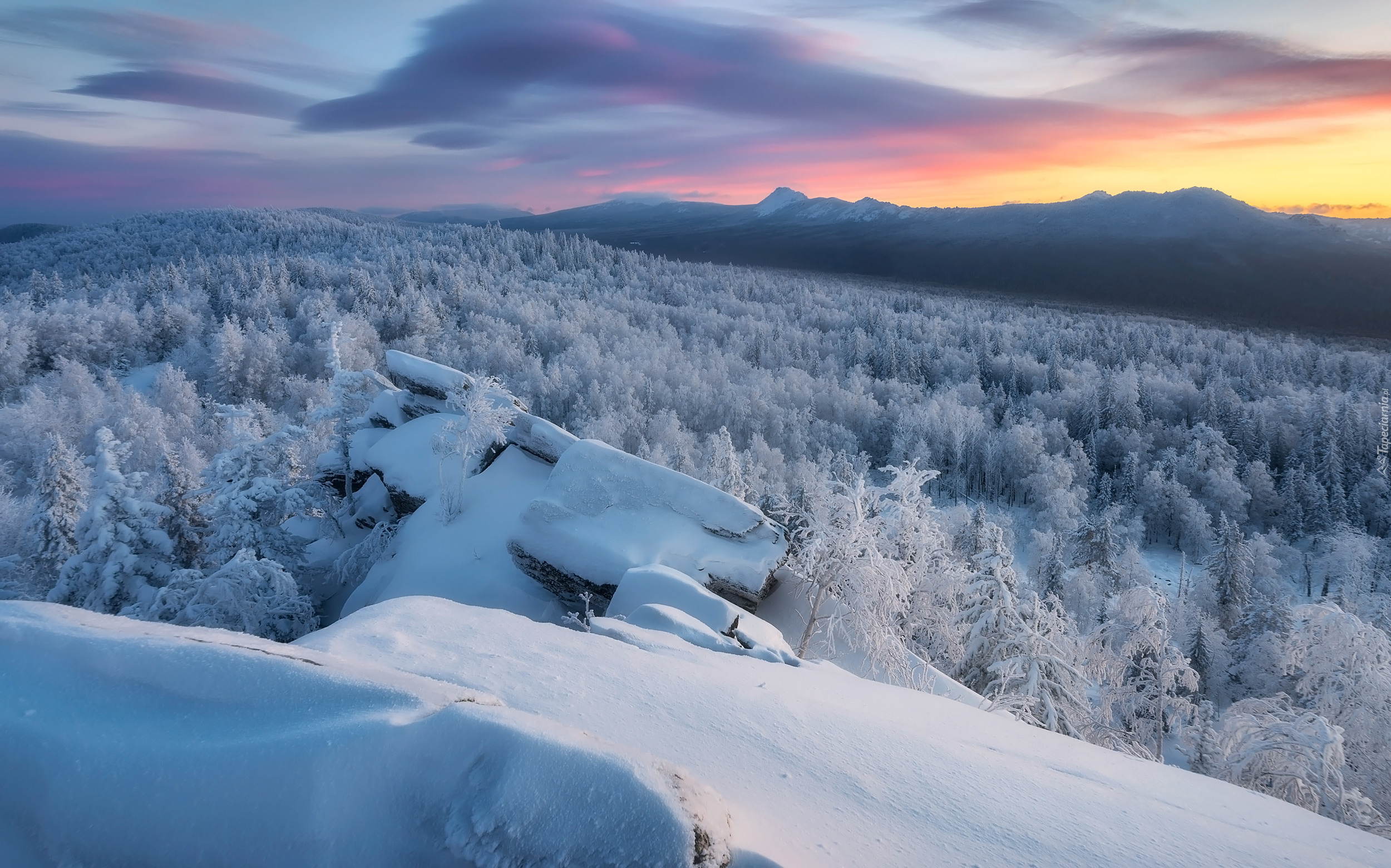 Edytor tapety: Kolorowe niebo nad górami i zaśnieżonym lasem