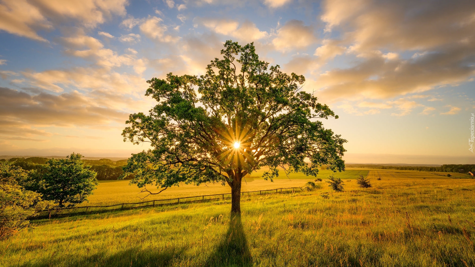Edytor tapety: Promienie słońca w gałęziach drzewa na ogrodzonej łące