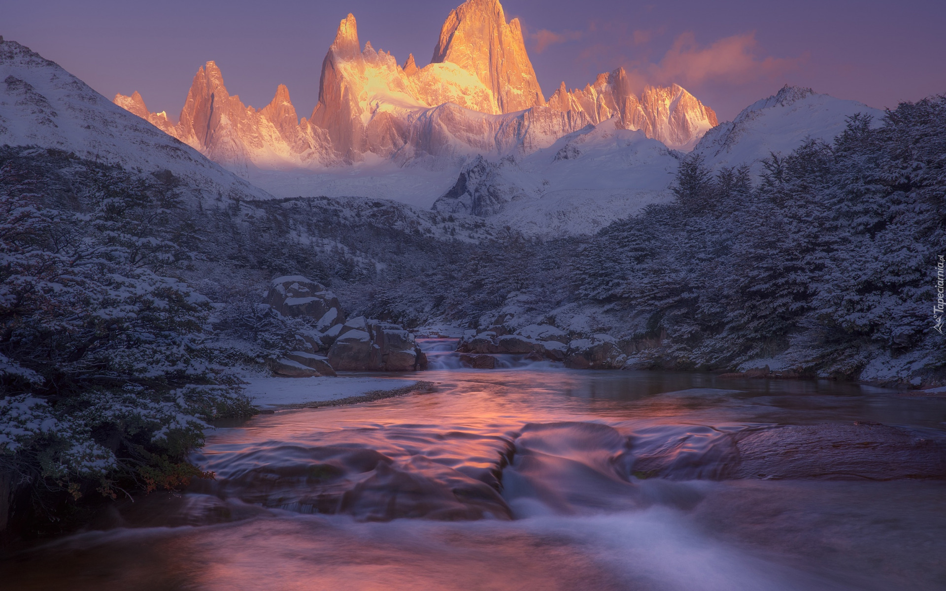 Edytor tapety: Rozświetlony i ośnieżony szczyt Fitz Roy w Argentynie