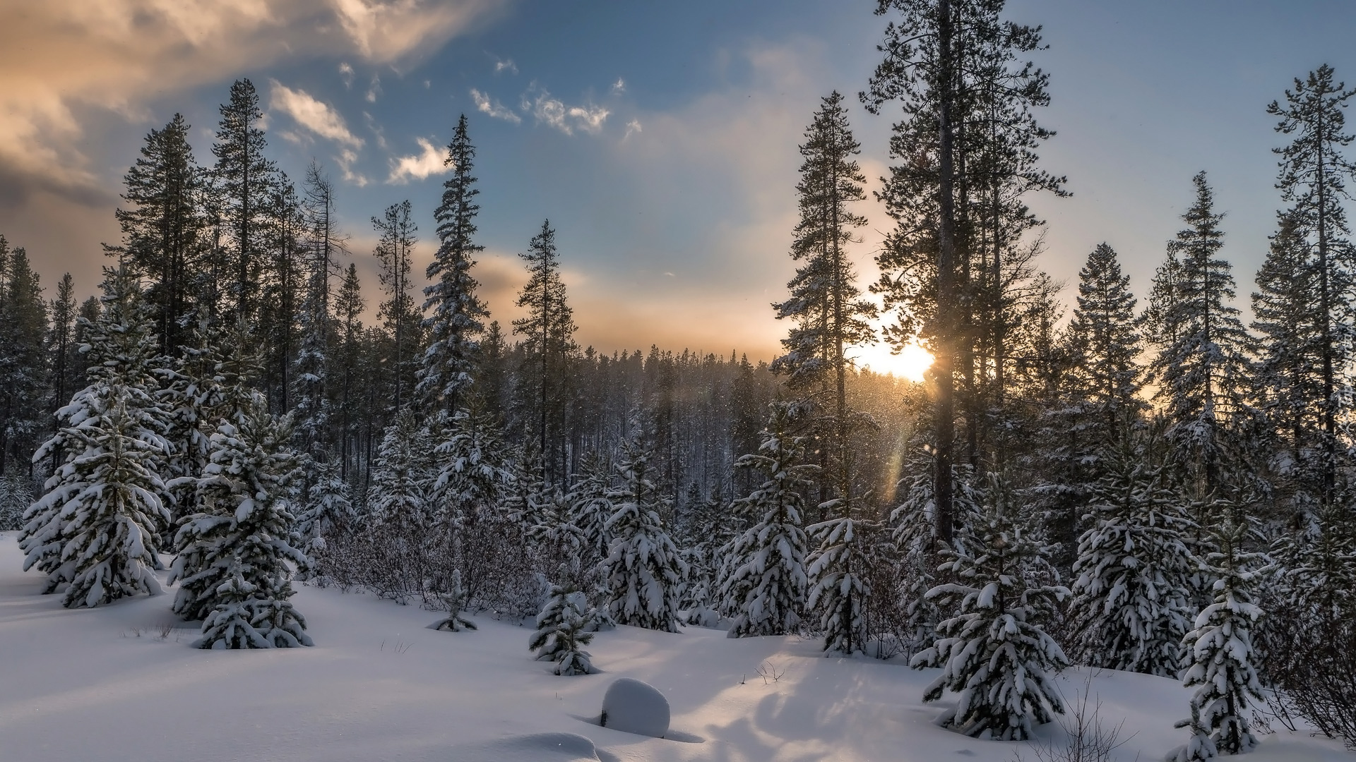 Edytor tapety: Blask słońca pomiędzy drzewami w zimowym lesie
