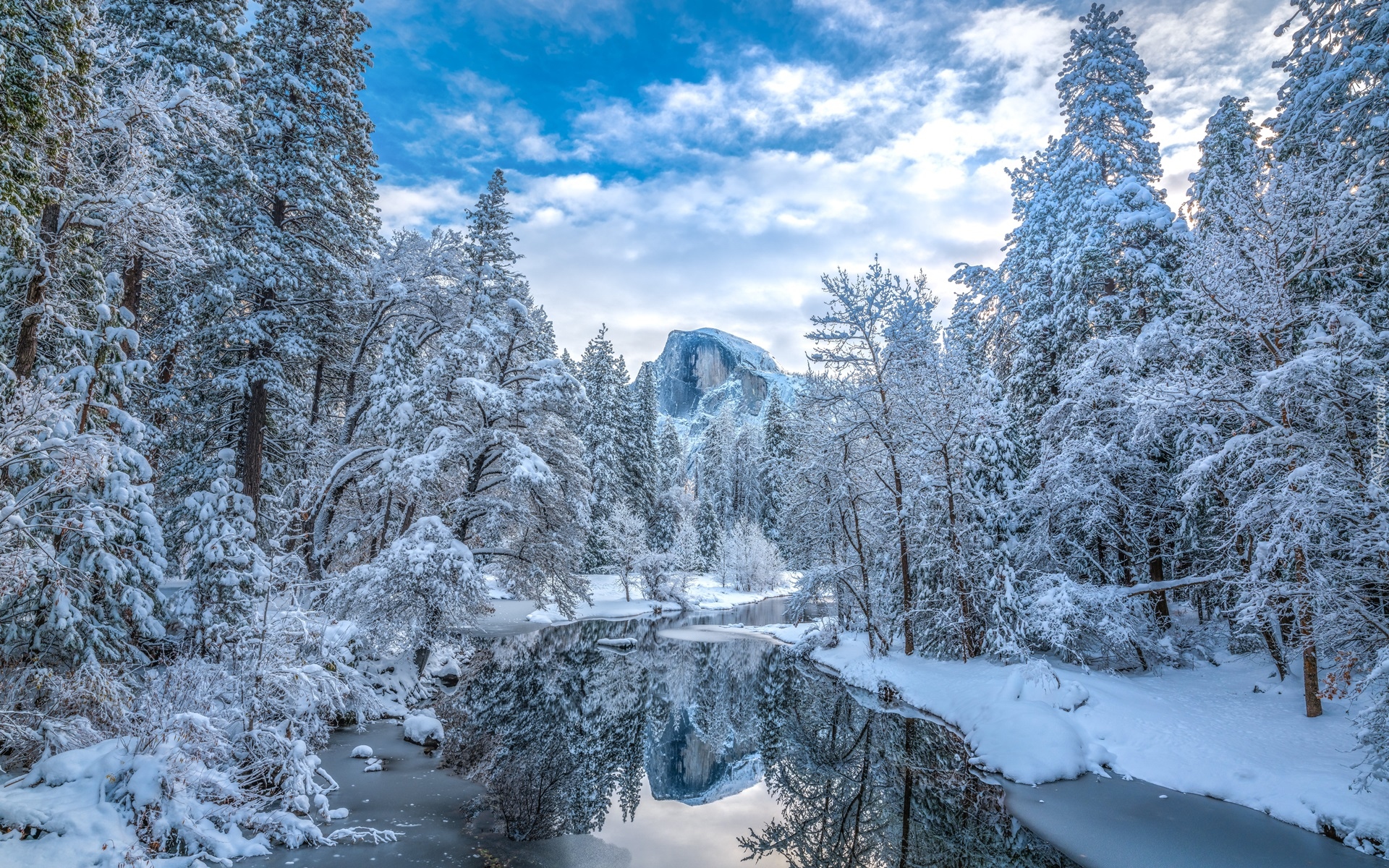 Edytor tapety: Zaśnieżone drzewa nad rzeką Merced w Kalifornii