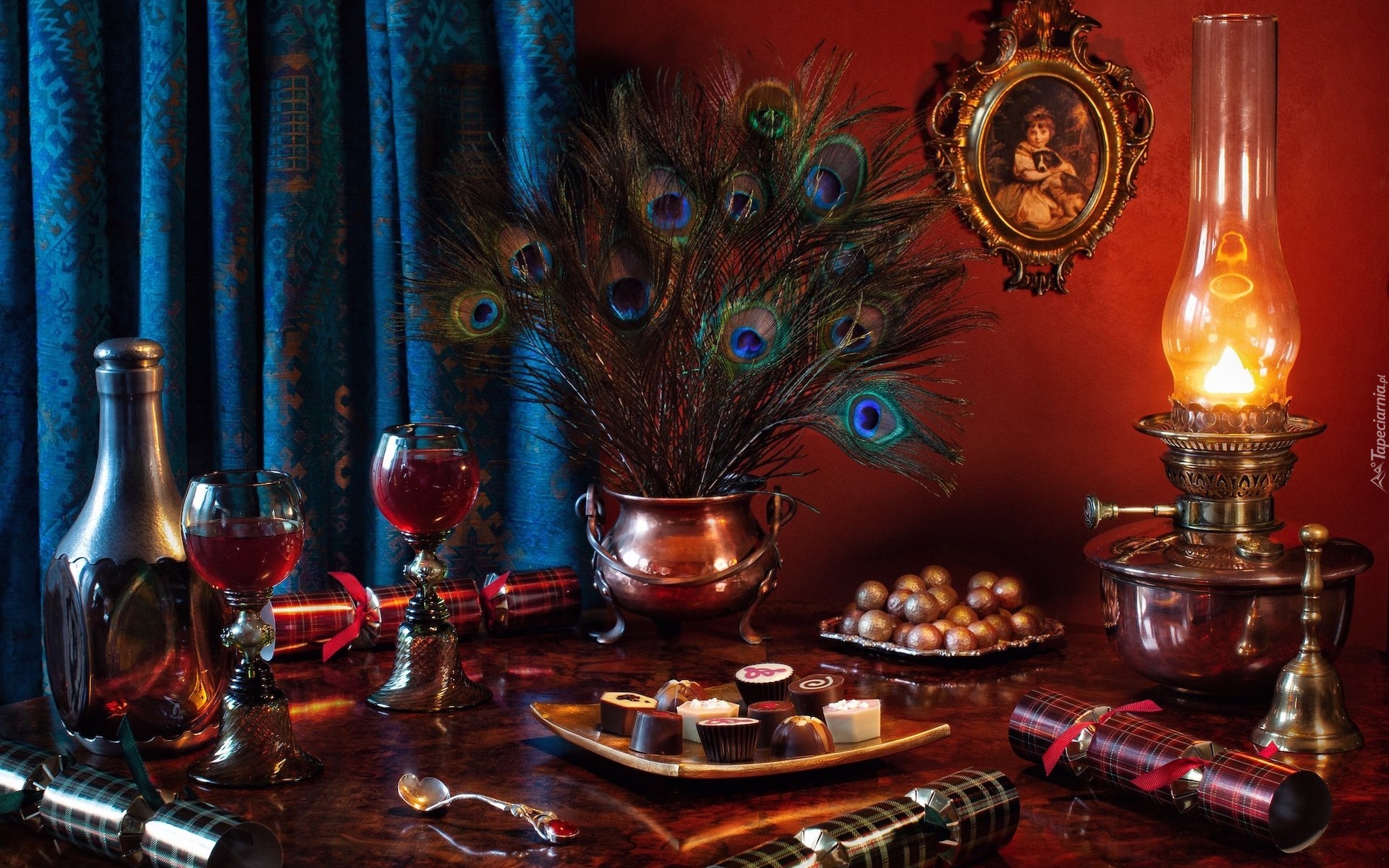 Edytor tapety: Pawie pióra obok lampy naftowej i butelki wina