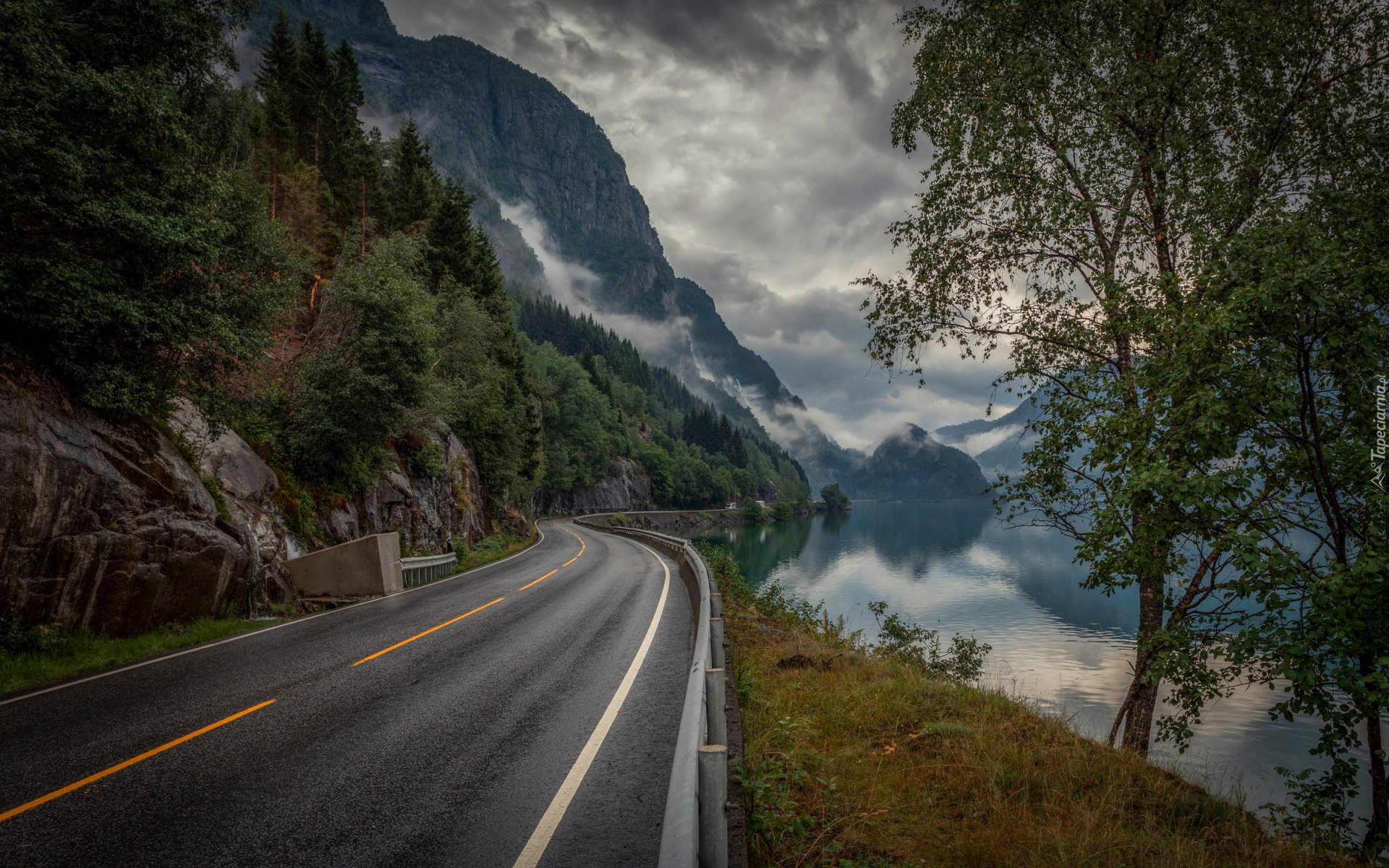 Edytor tapety: Drzewa na skałach i asfaltowa droga wzdłuż jeziora