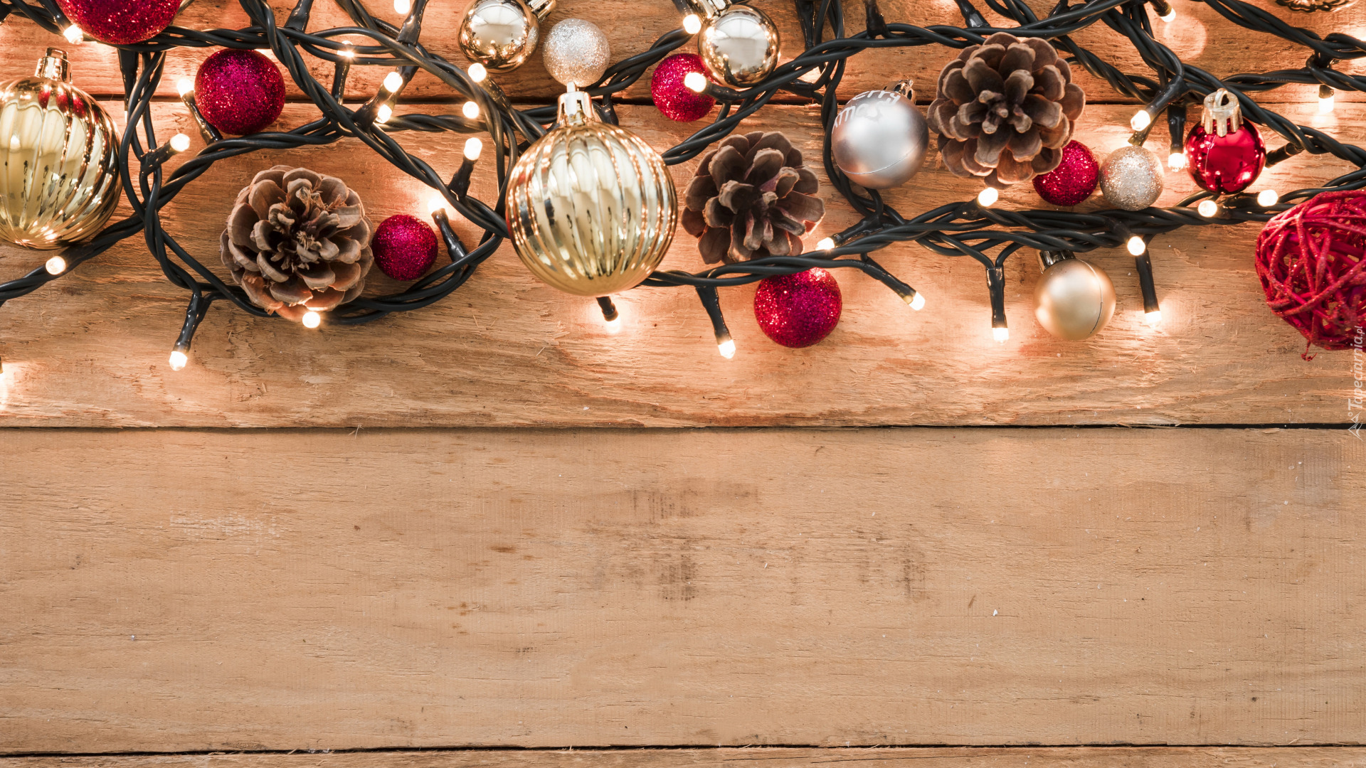 Edytor tapety: Bombki i lampki pośród światełek na deskach