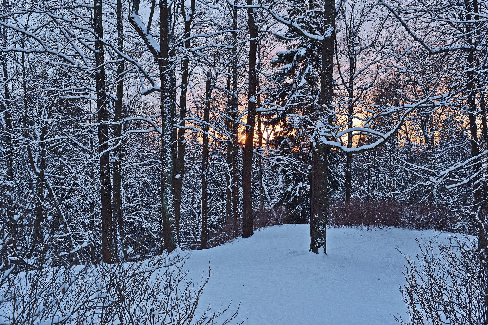 Edytor tapety: Widok zza ośnieżonych drzew na zachodzące słońce