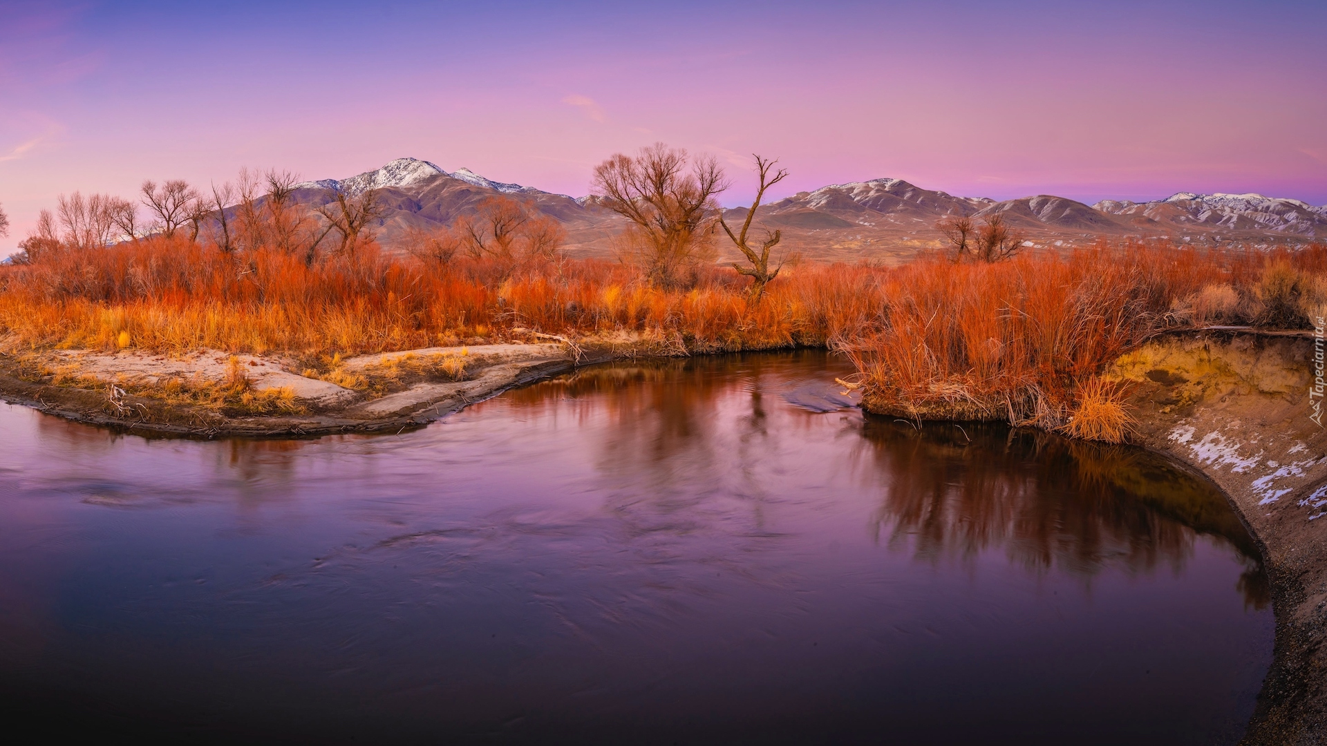 Edytor tapety: Drzewa i pożółkłe trawy nad rzeką Owens River