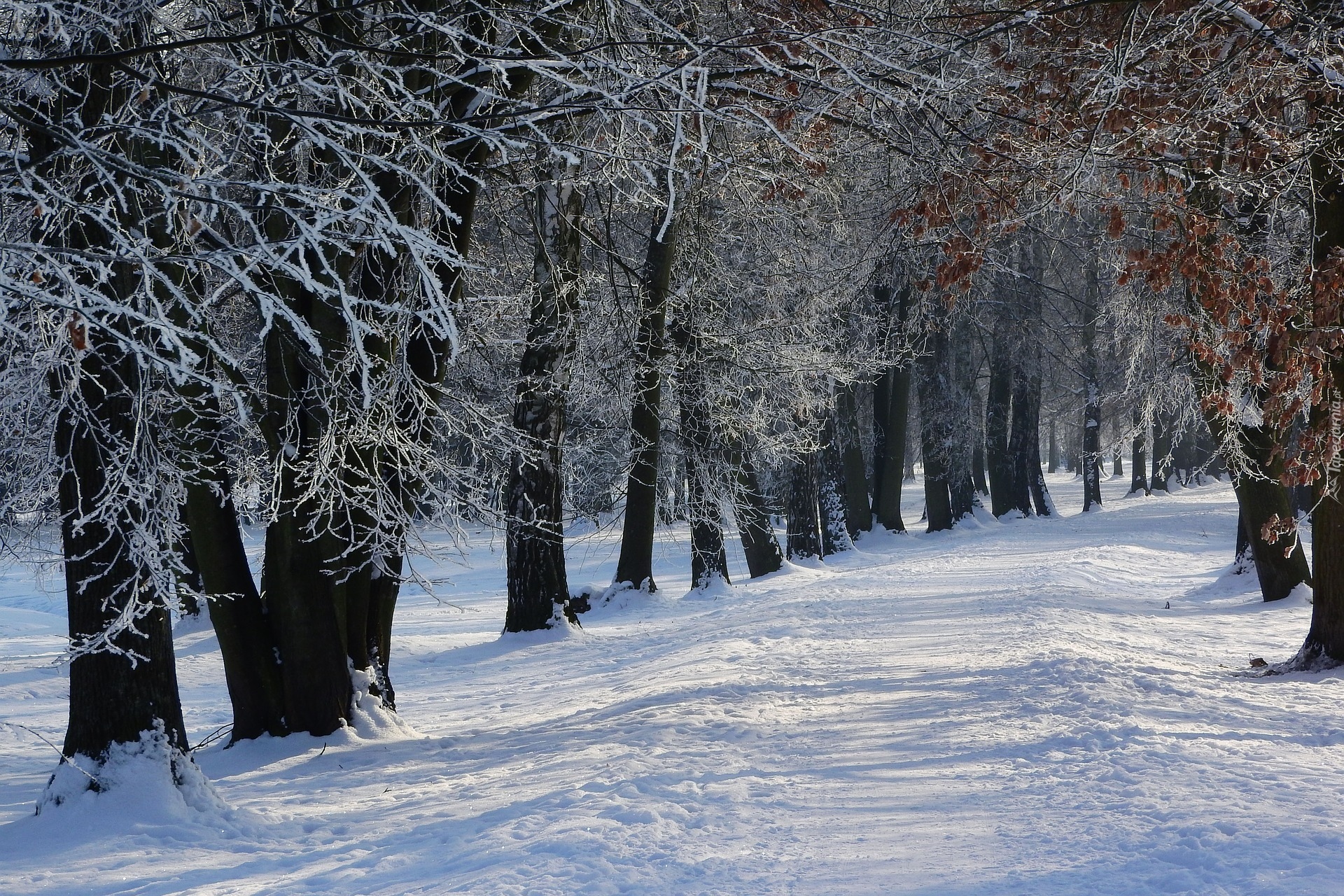 Edytor tapety: Oszronione drzewa przy zaśnieżonej drodze w lesie