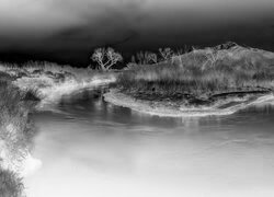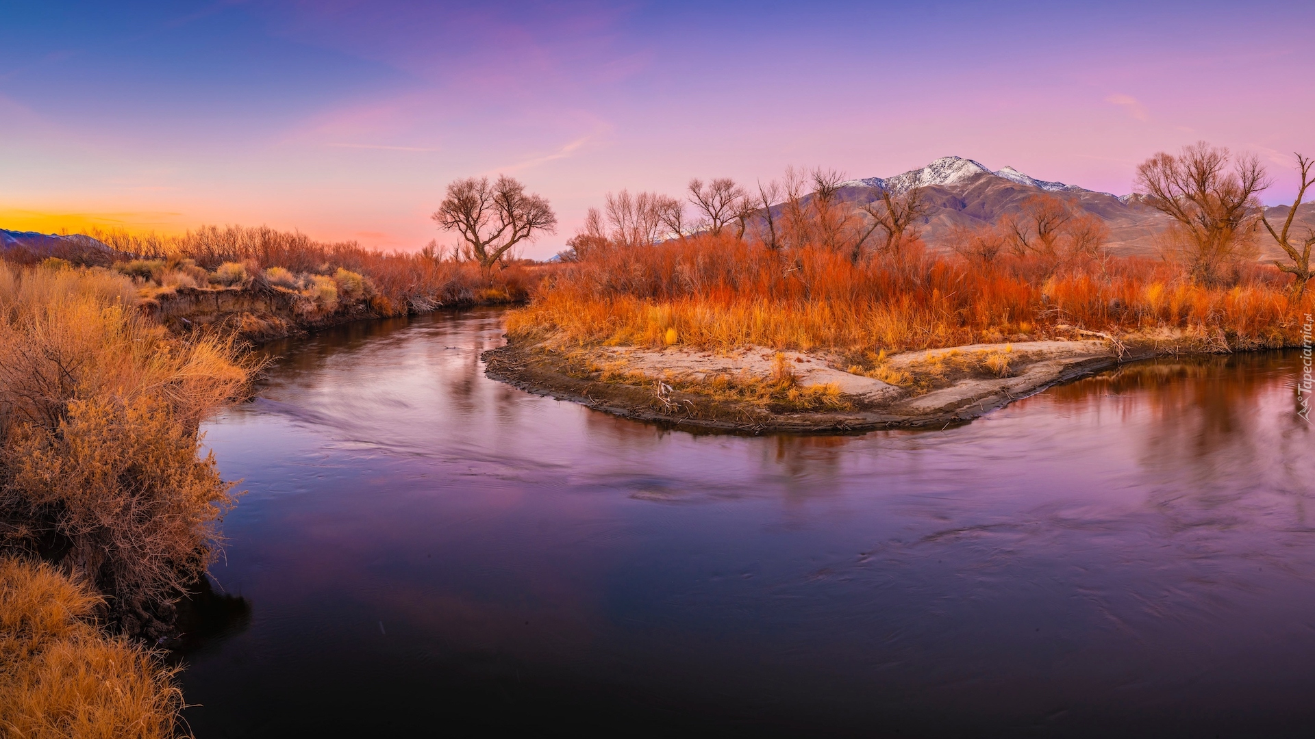 Edytor tapety: Pożółkłe trawy i drzewa nad rzeką Owens River