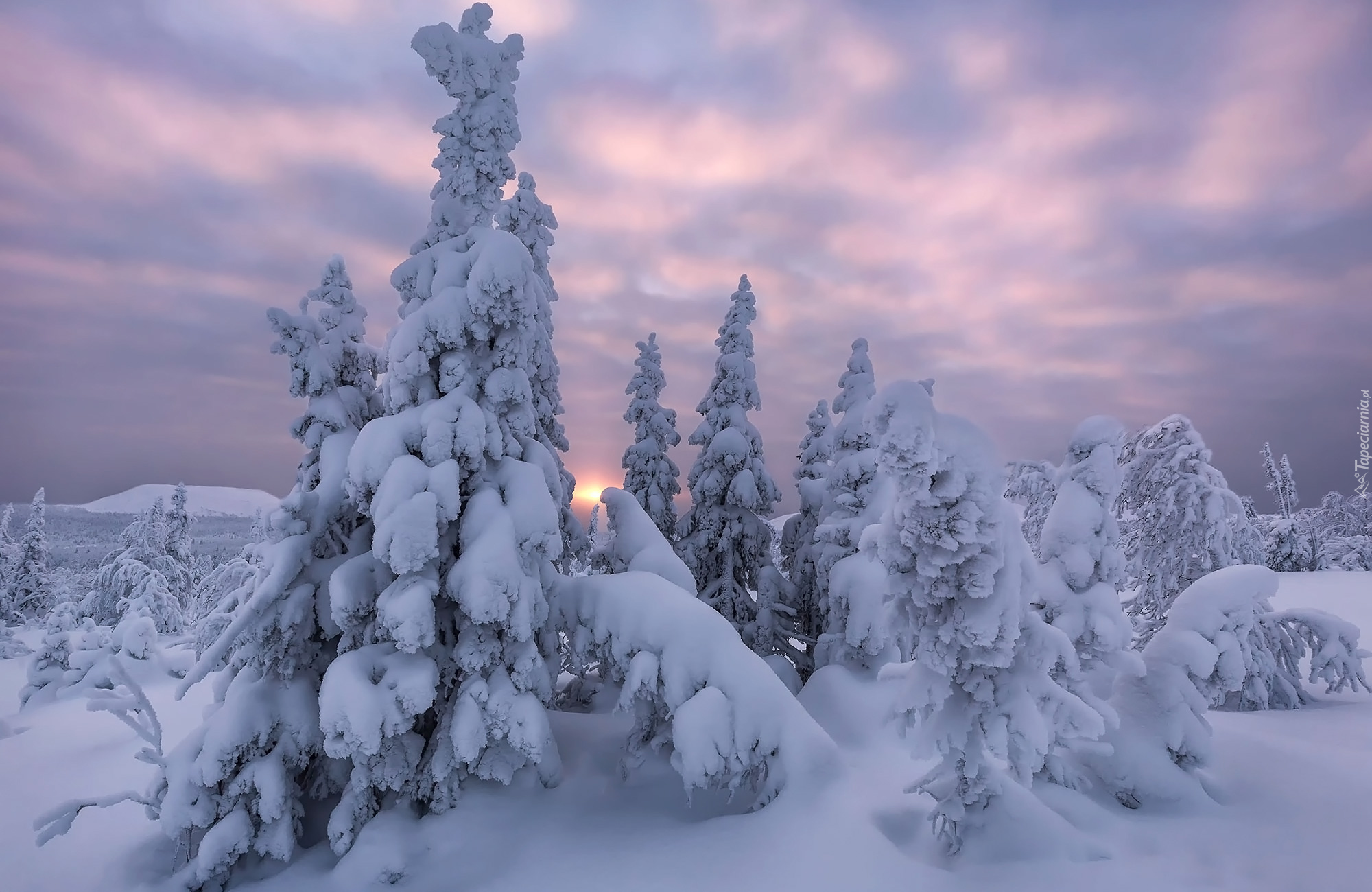 Edytor tapety: Zaśnieżone drzewa w zaspach na tle zaróżowionego nieba