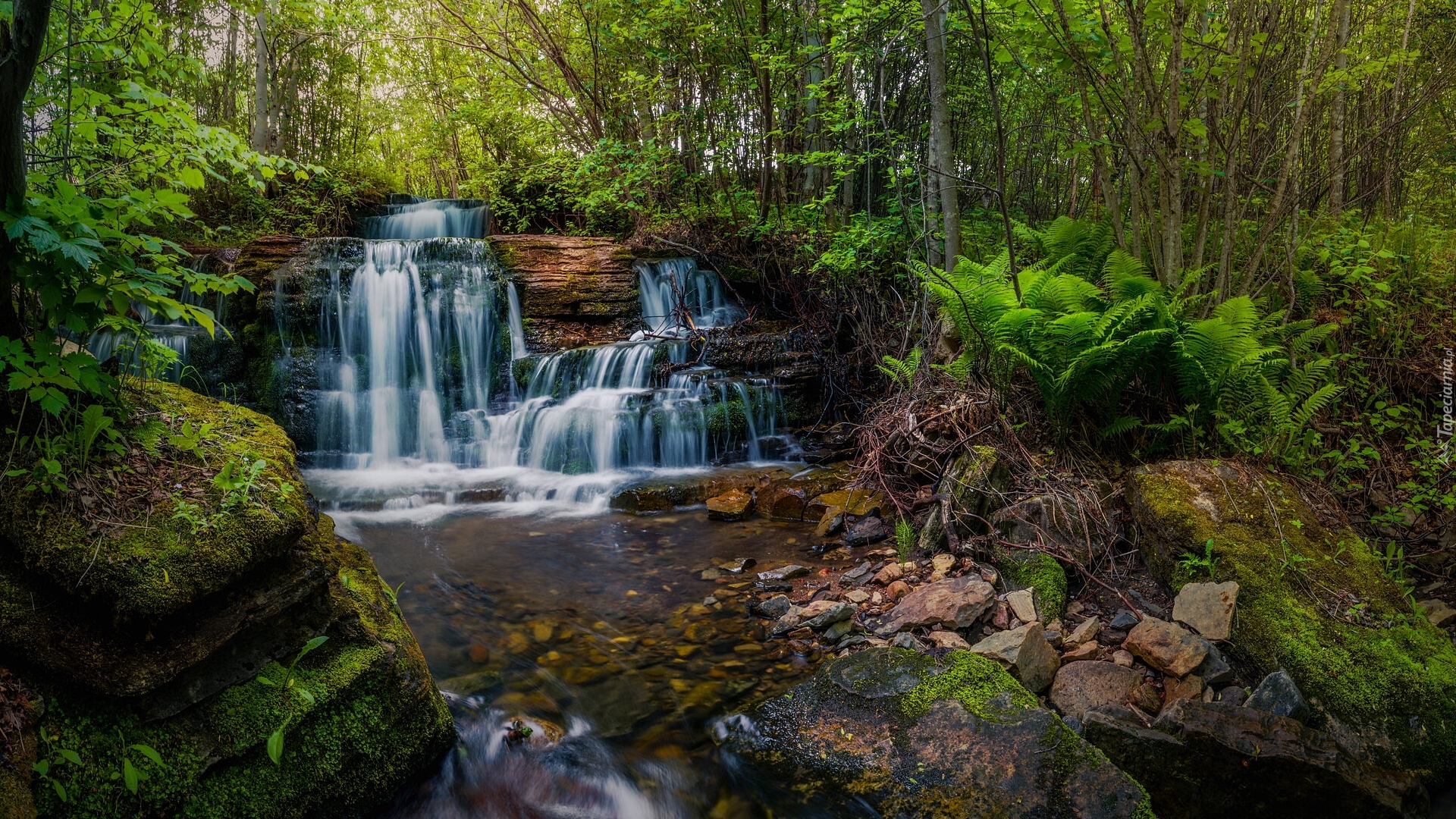 Edytor tapety: Paprocie obok leśnej rzeki płynącej po skale