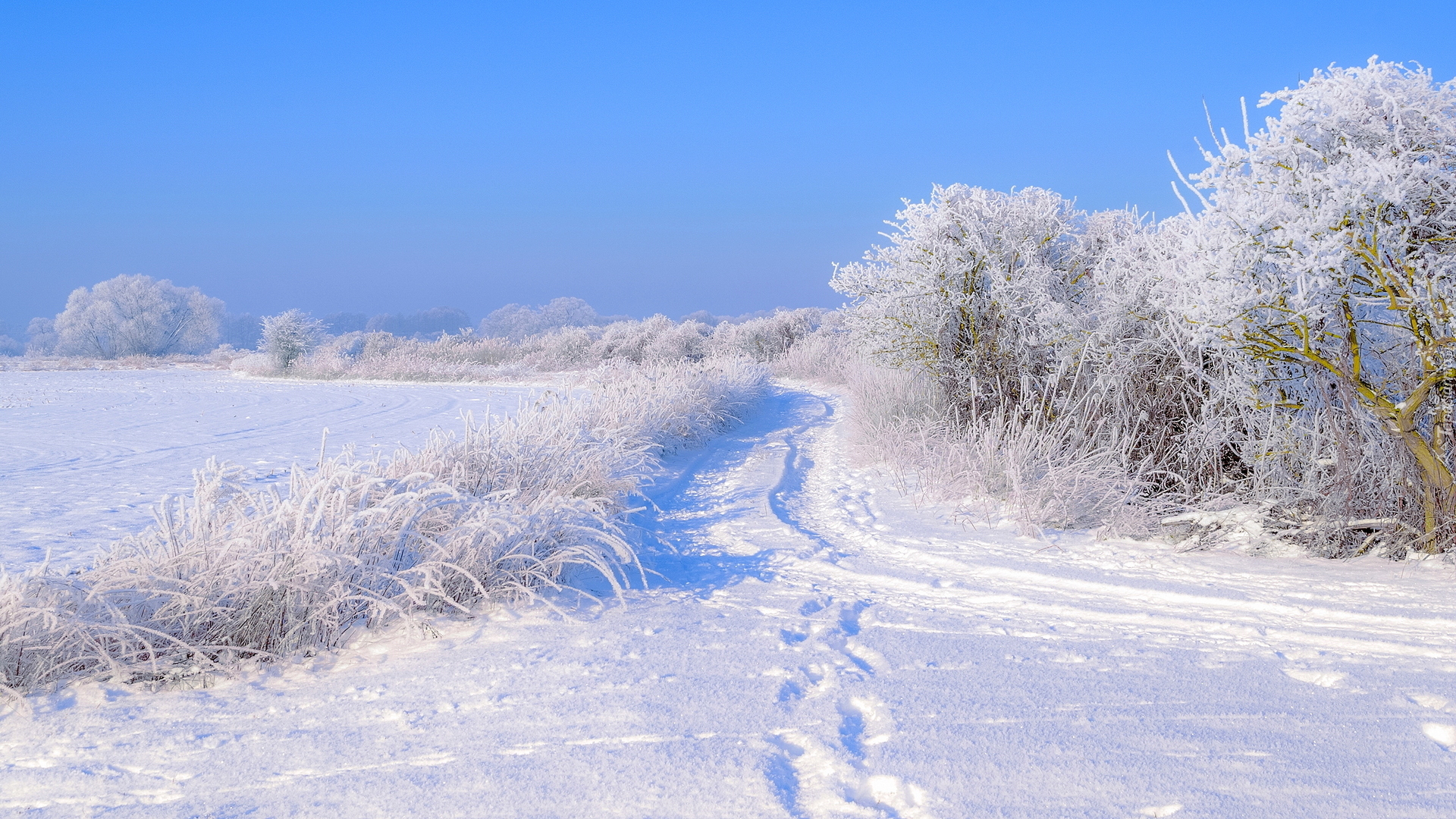 Edytor tapety: Ośnieżone krzewy przy polnej drodze pod błękitnym niebem