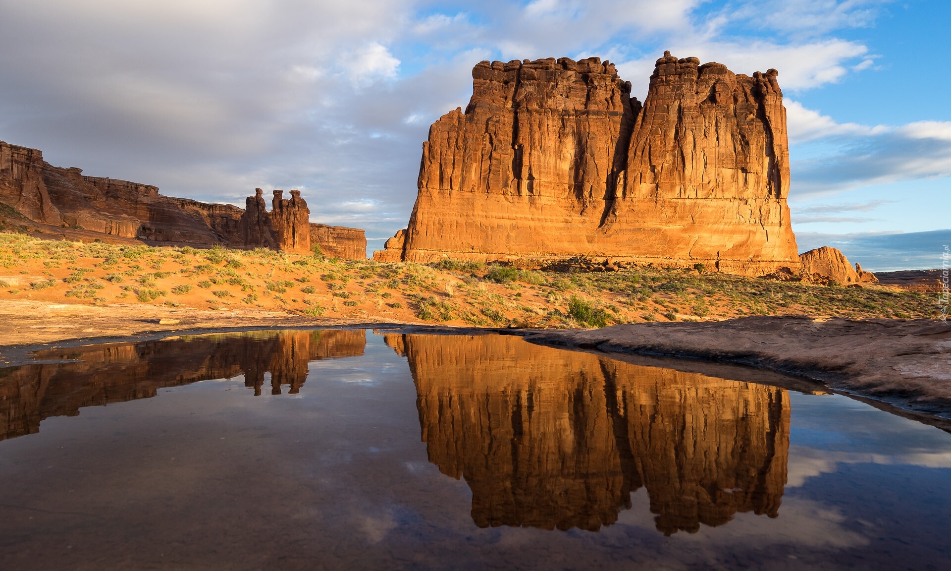 Edytor tapety: Odbicie formacji skalnej Courthouse Towers w kałuży