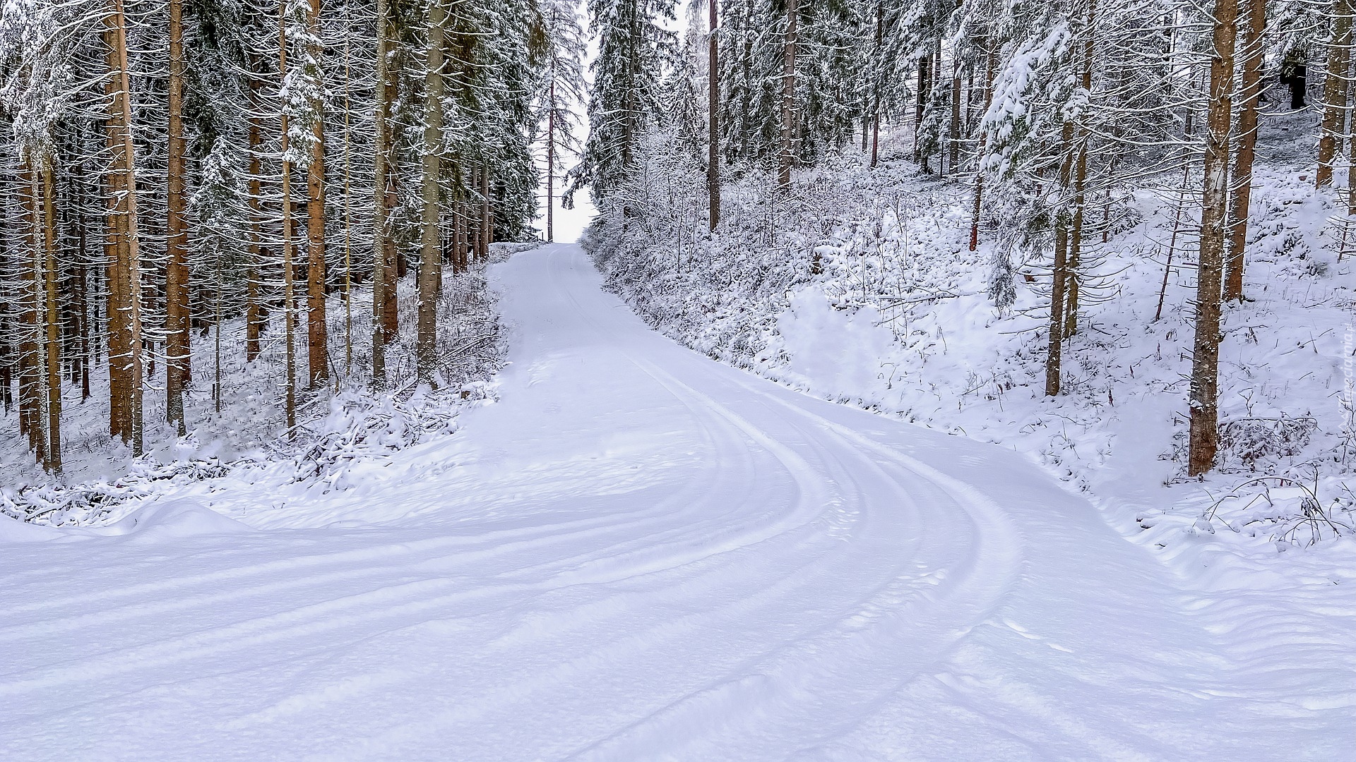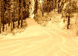 Edytor tapety: Drzewa przy drodze w ośnieżonym lesie