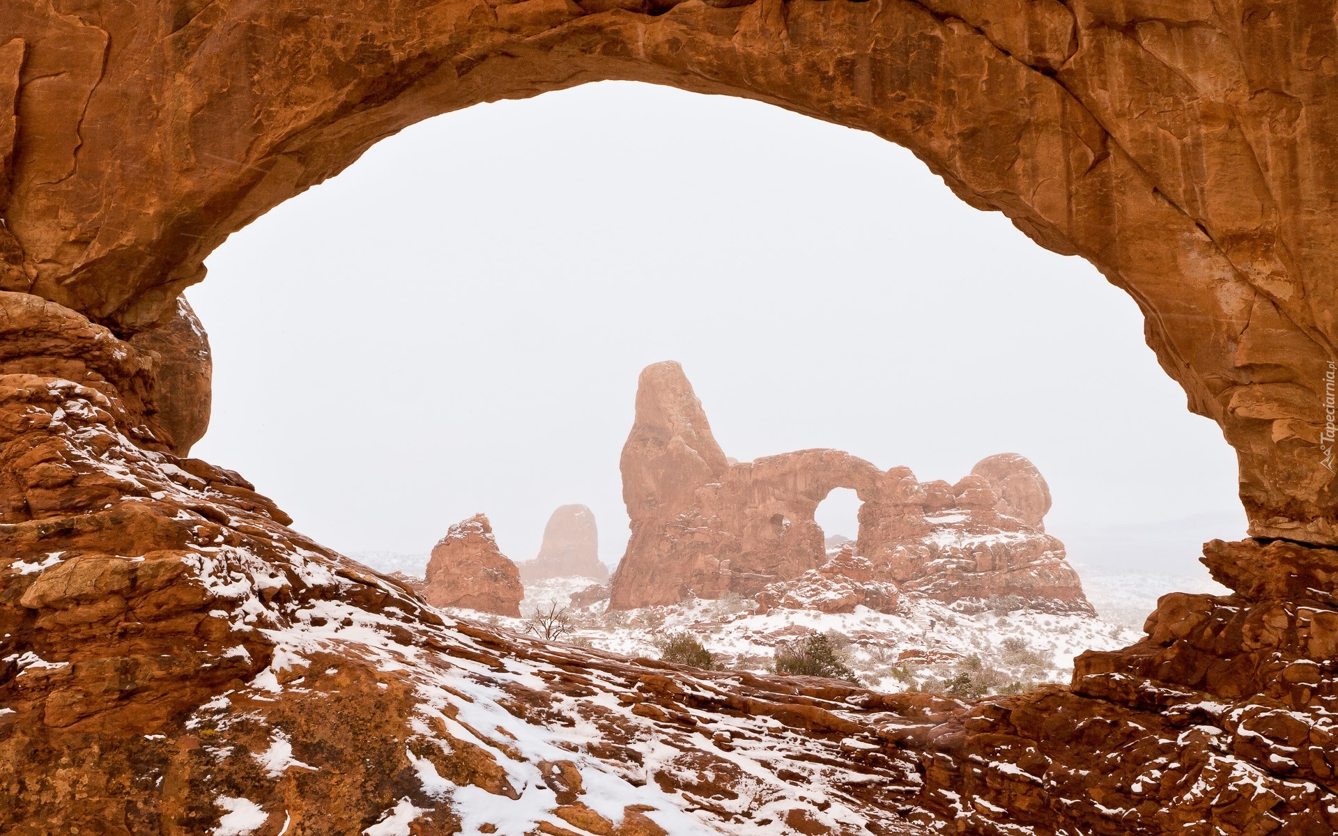 Edytor tapety: Widok na ośnieżoną formację skalną Turret Arch
