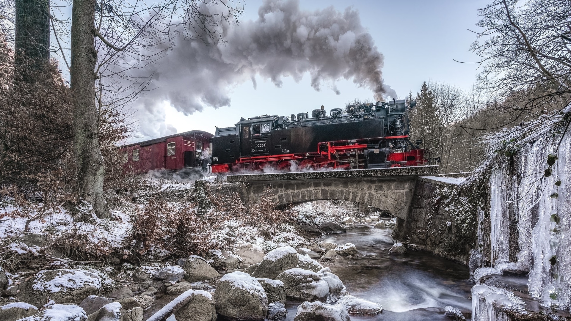 Edytor tapety: Pociąg parowy przejeżdżający przez most