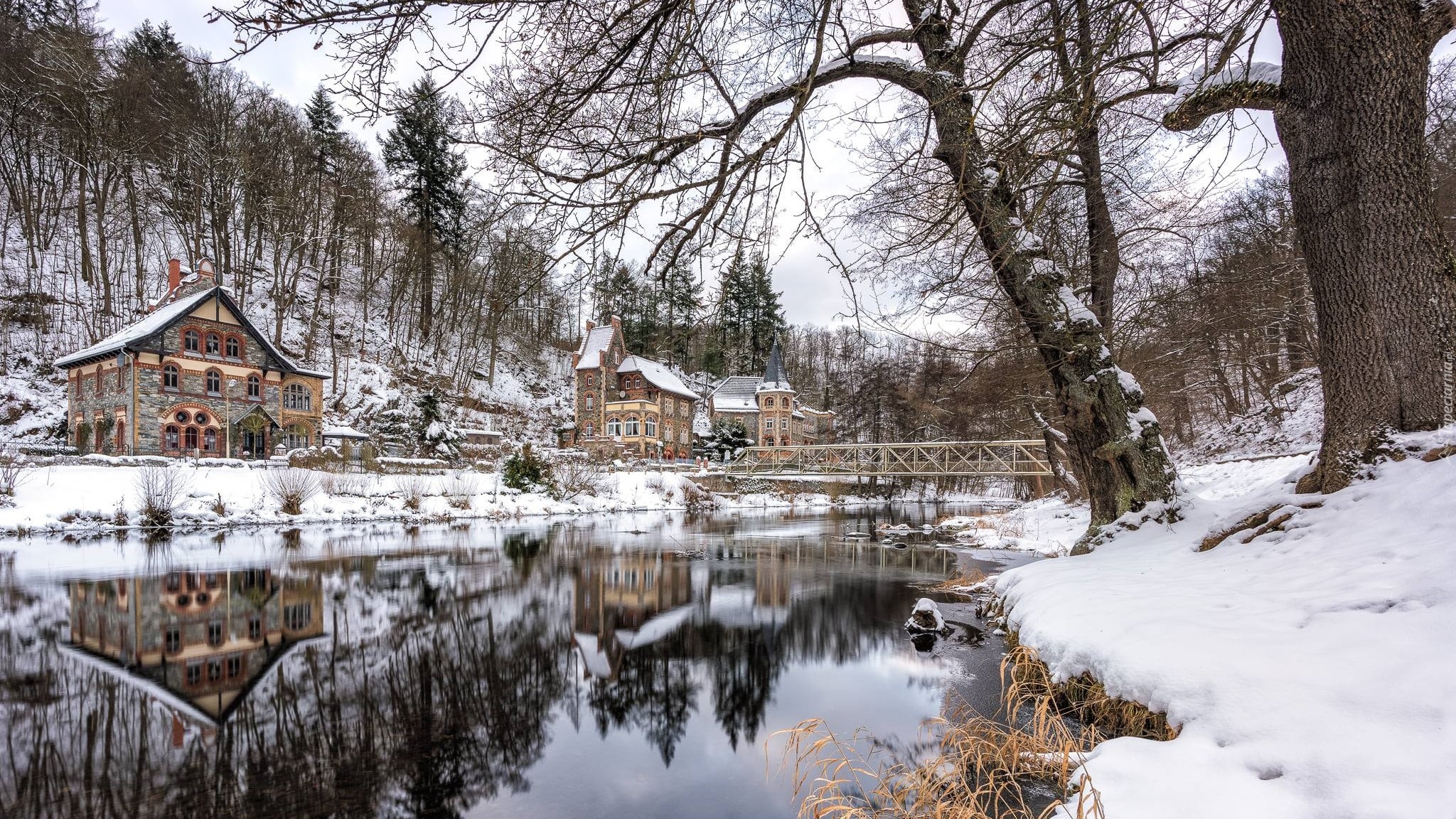 Edytor tapety: Hotel Bodeblick nad rzeką Bode zimową porą