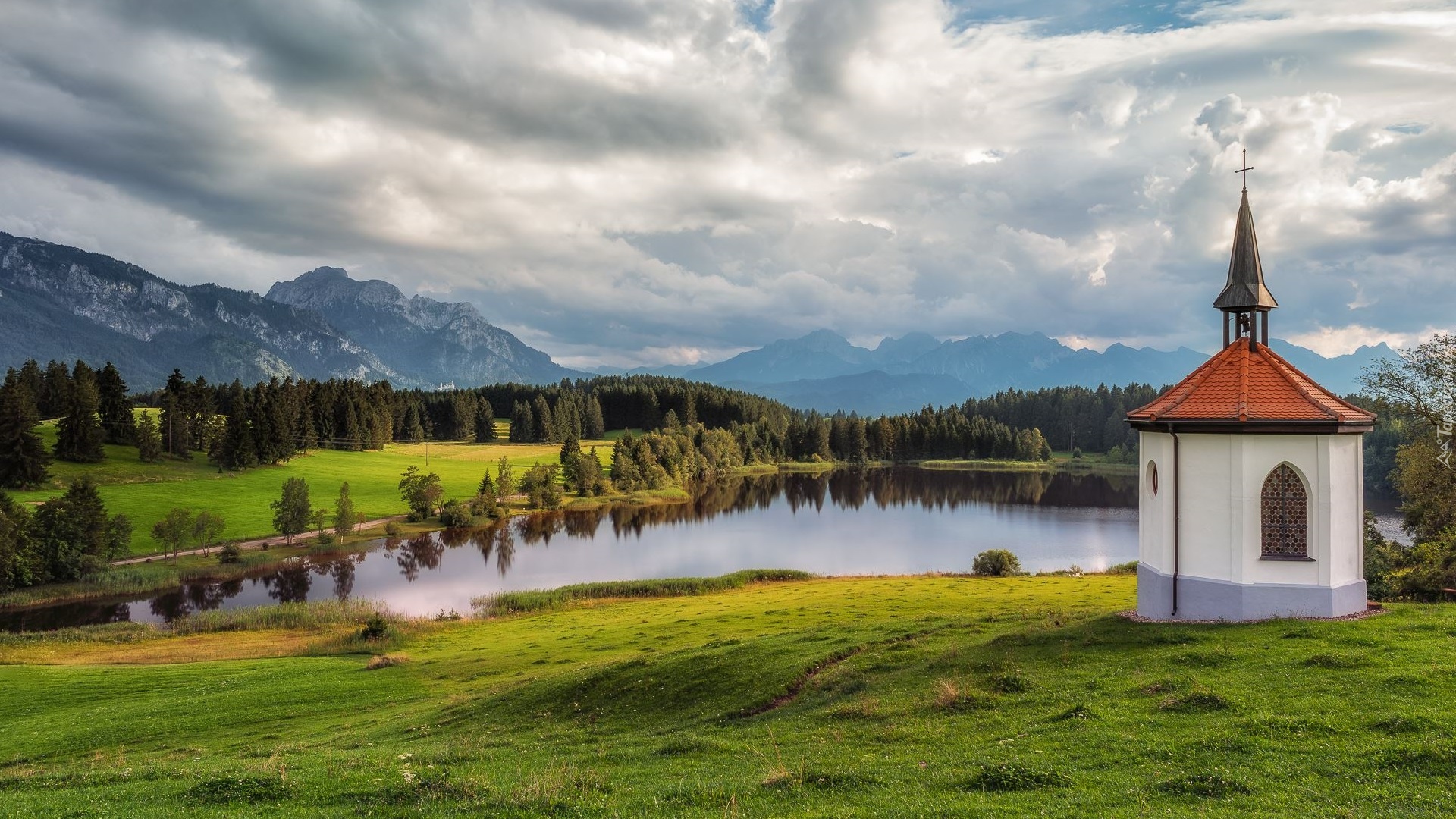Edytor tapety: Kapliczka Hegratsried Chapel i jezioro Hegratsriedsee