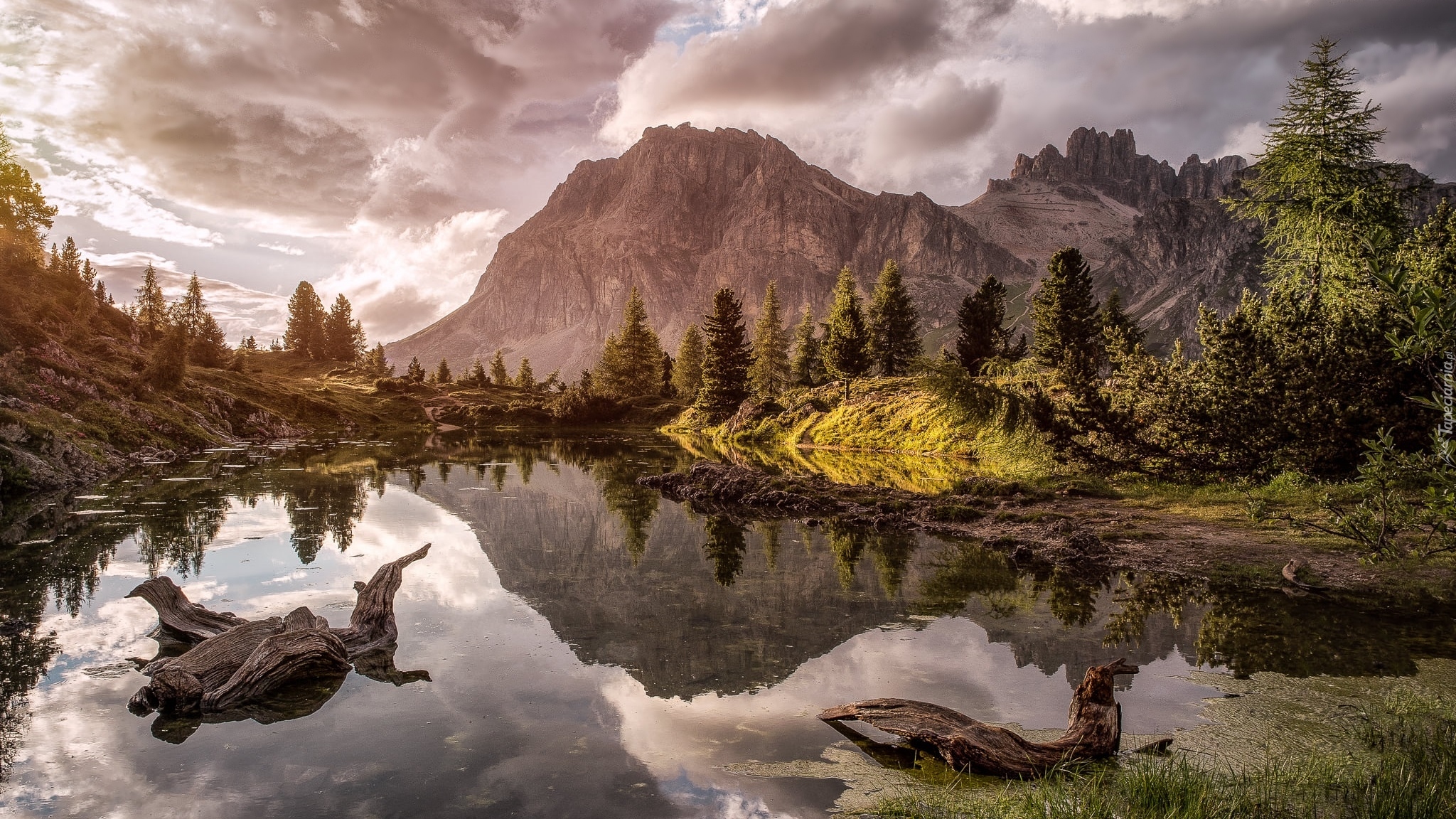 Edytor tapety: Odbicie Dolomitów i chmur w jeziorze Lago Limides
