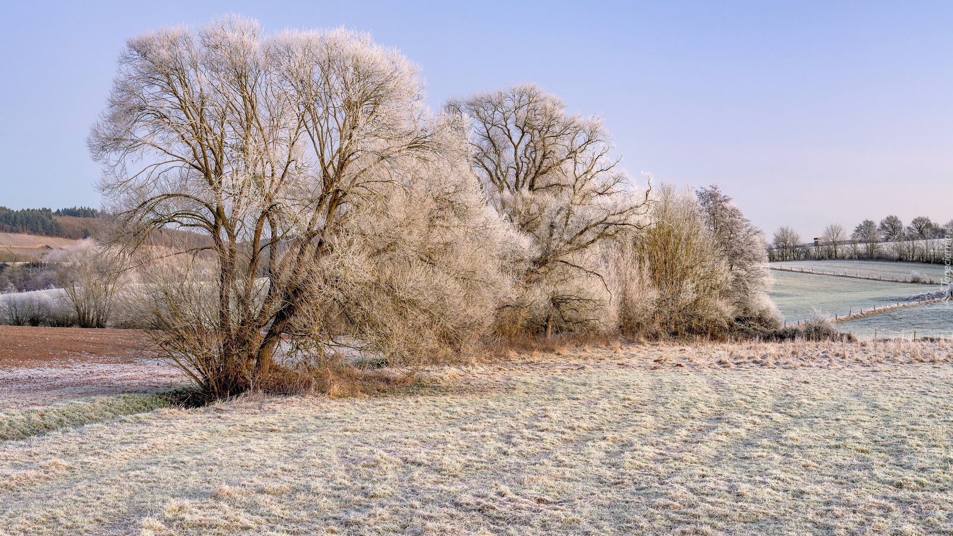 Edytor tapety: Oszronione drzewa na polach