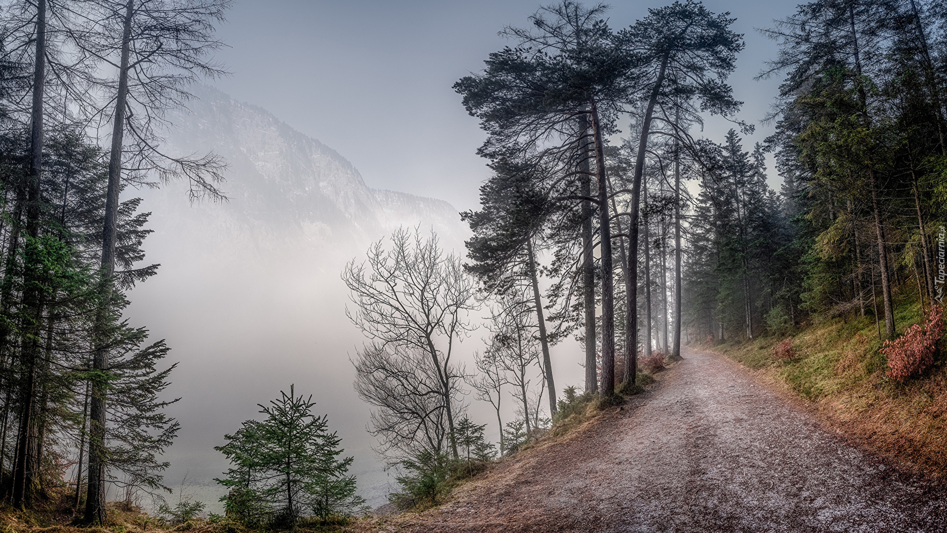 Edytor tapety: Drzewa przy drodze i zamglone góry