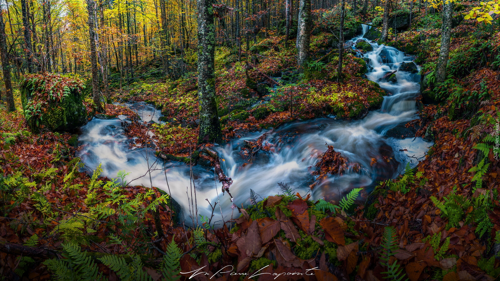 Edytor tapety: Paprocie i opadłe liscie przy strumyku w lesie