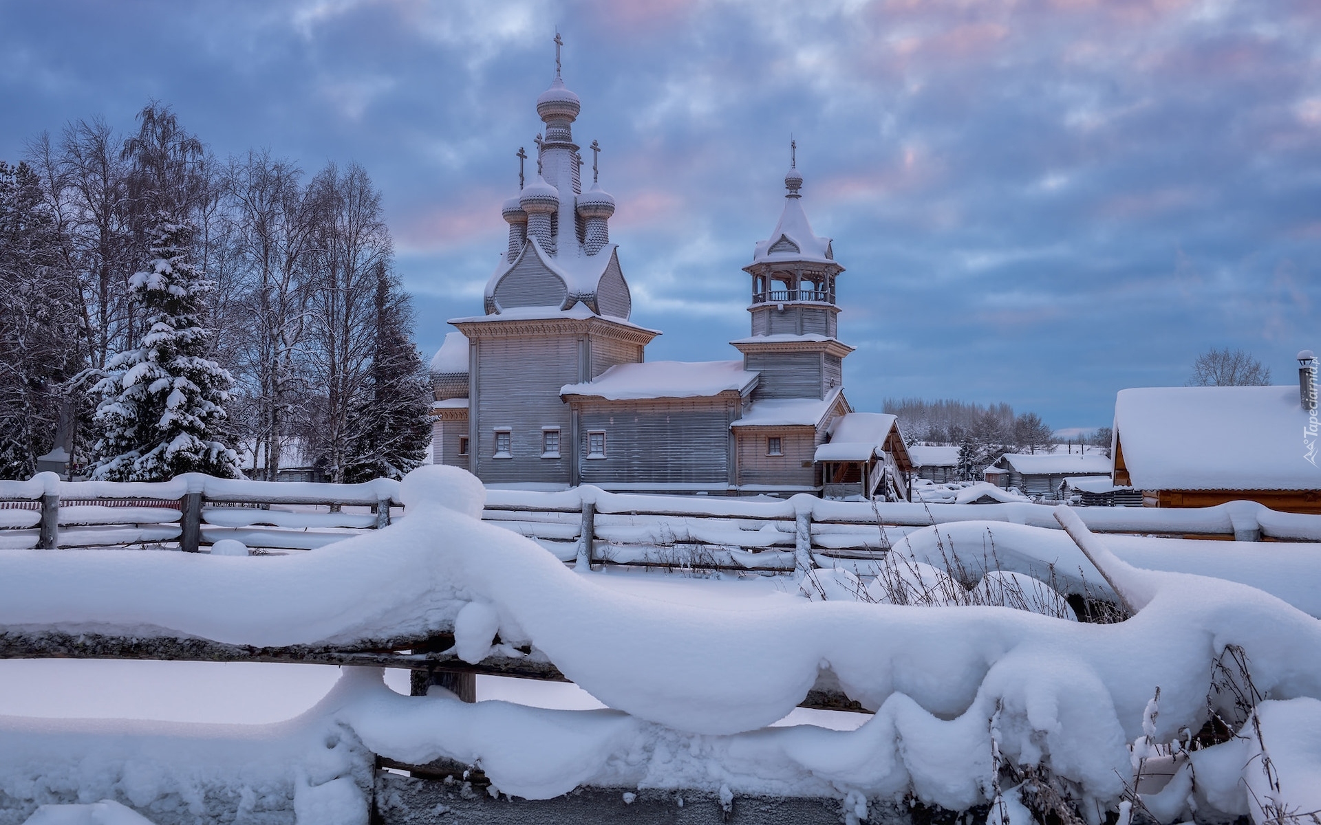 Edytor tapety: Cerkiew za ośnieżonym ogrodzeniem we wsi Kimzha