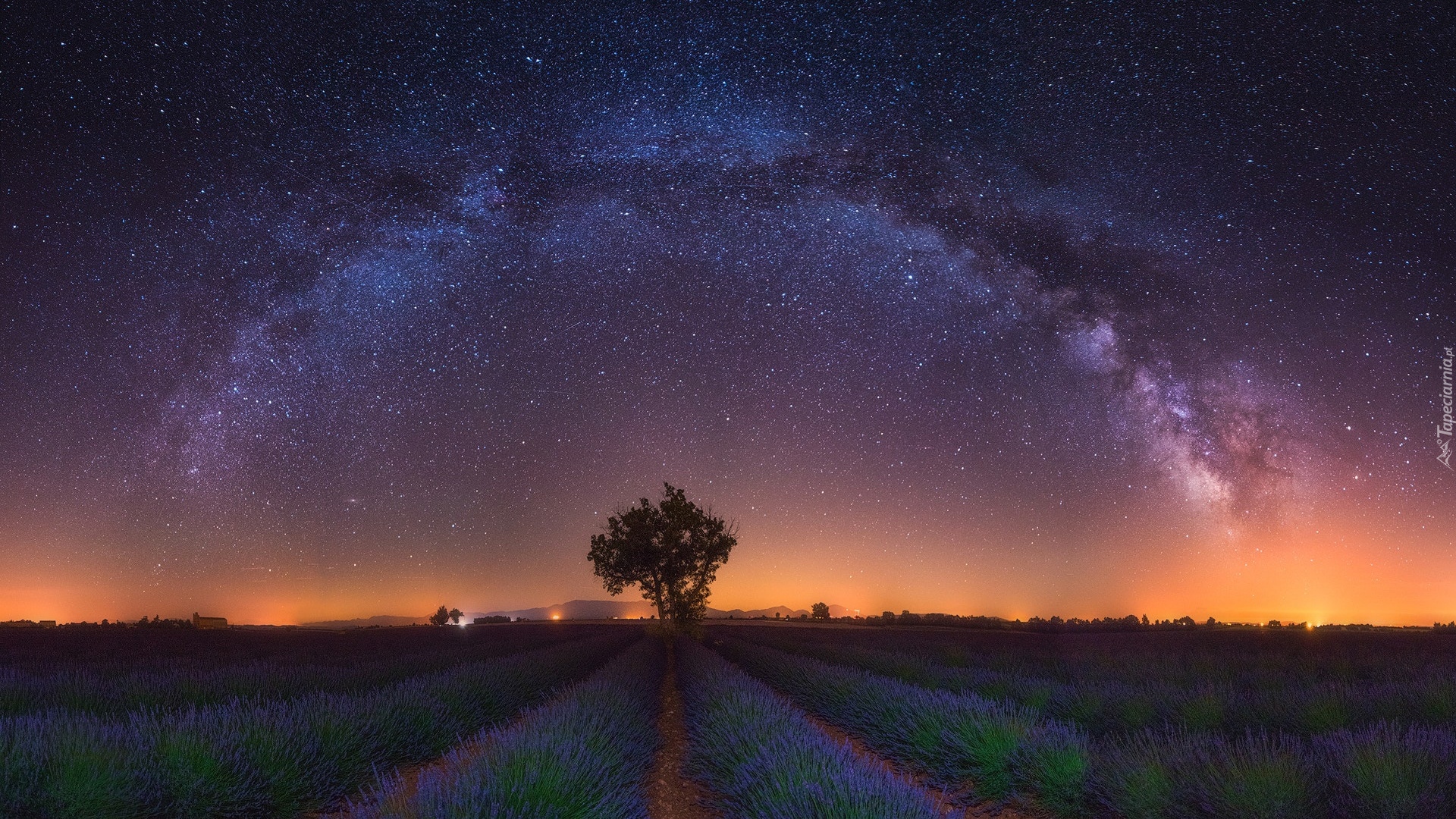 Edytor tapety: Rozgwieżdżone niebo nad polem lawendy
