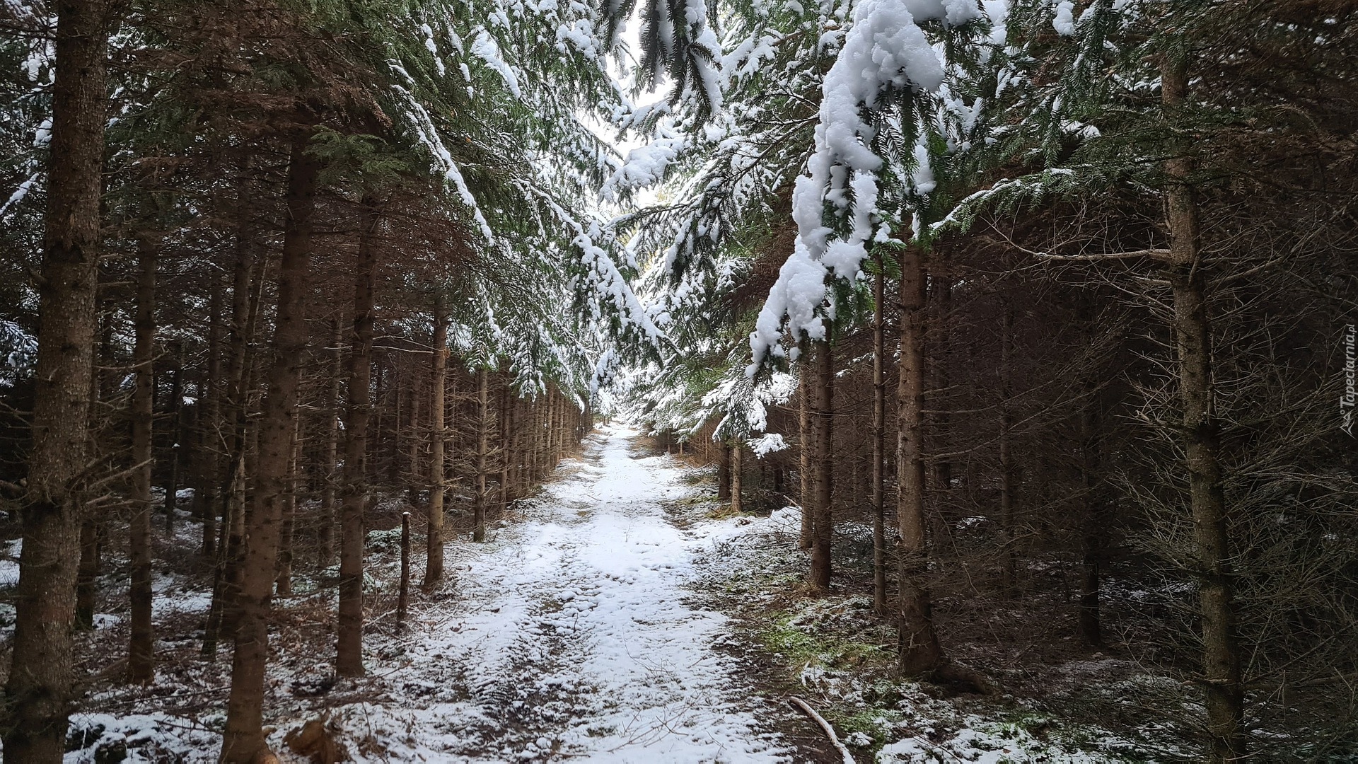 Edytor tapety: Śnieg na drzewach i ścieżce w iglastym lesie