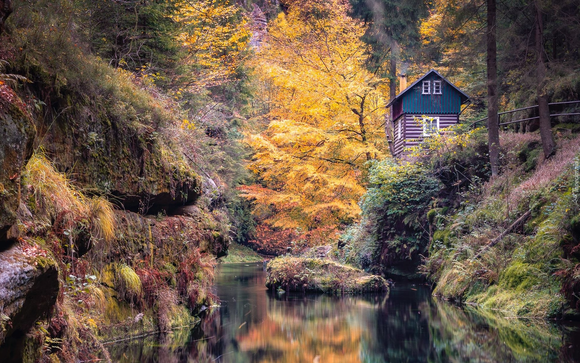 Edytor tapety: Dom na skałach nad rzeką Kamienica w Czechach