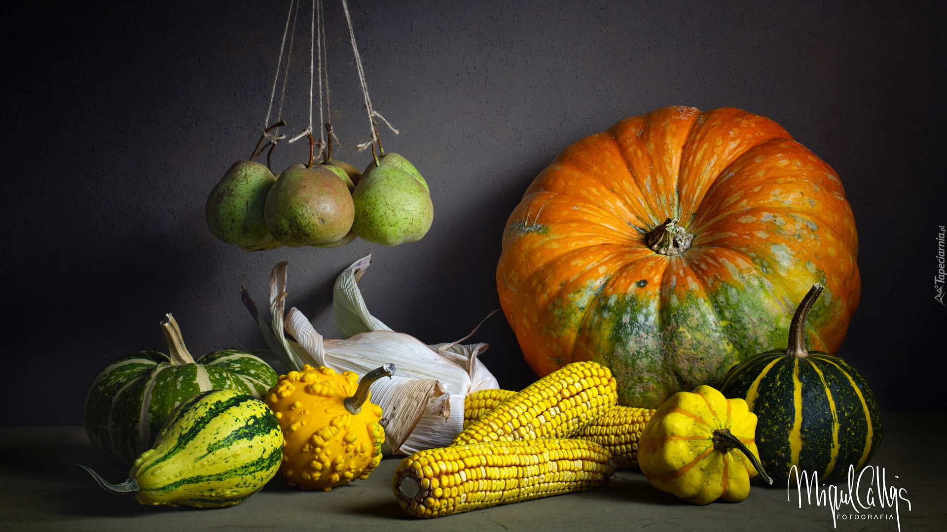 Edytor tapety: Gruszki na sznurkach nad dyniami i kukurydzą