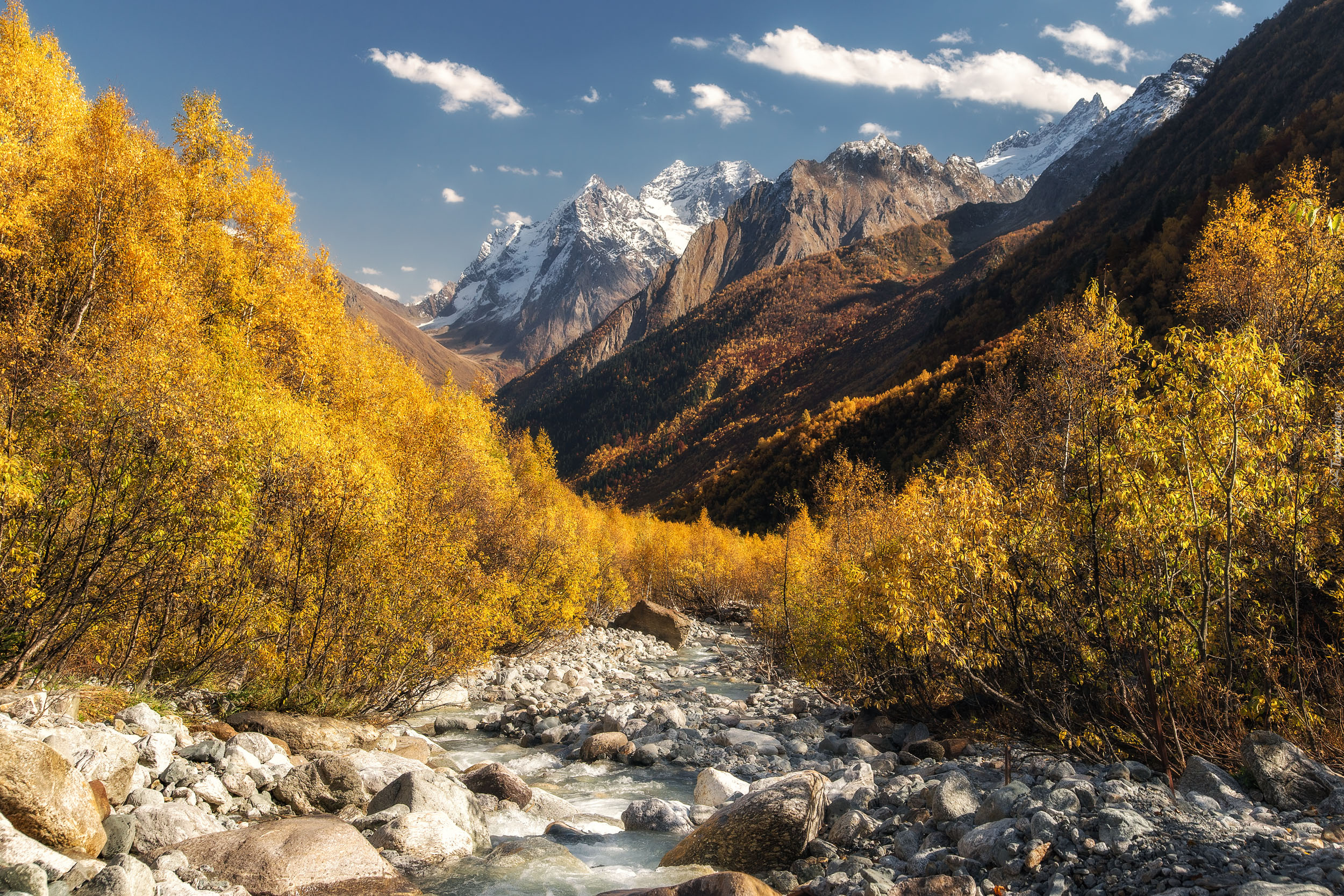 Edytor tapety: Pożółkłe drzewa nad górskim strumieniem