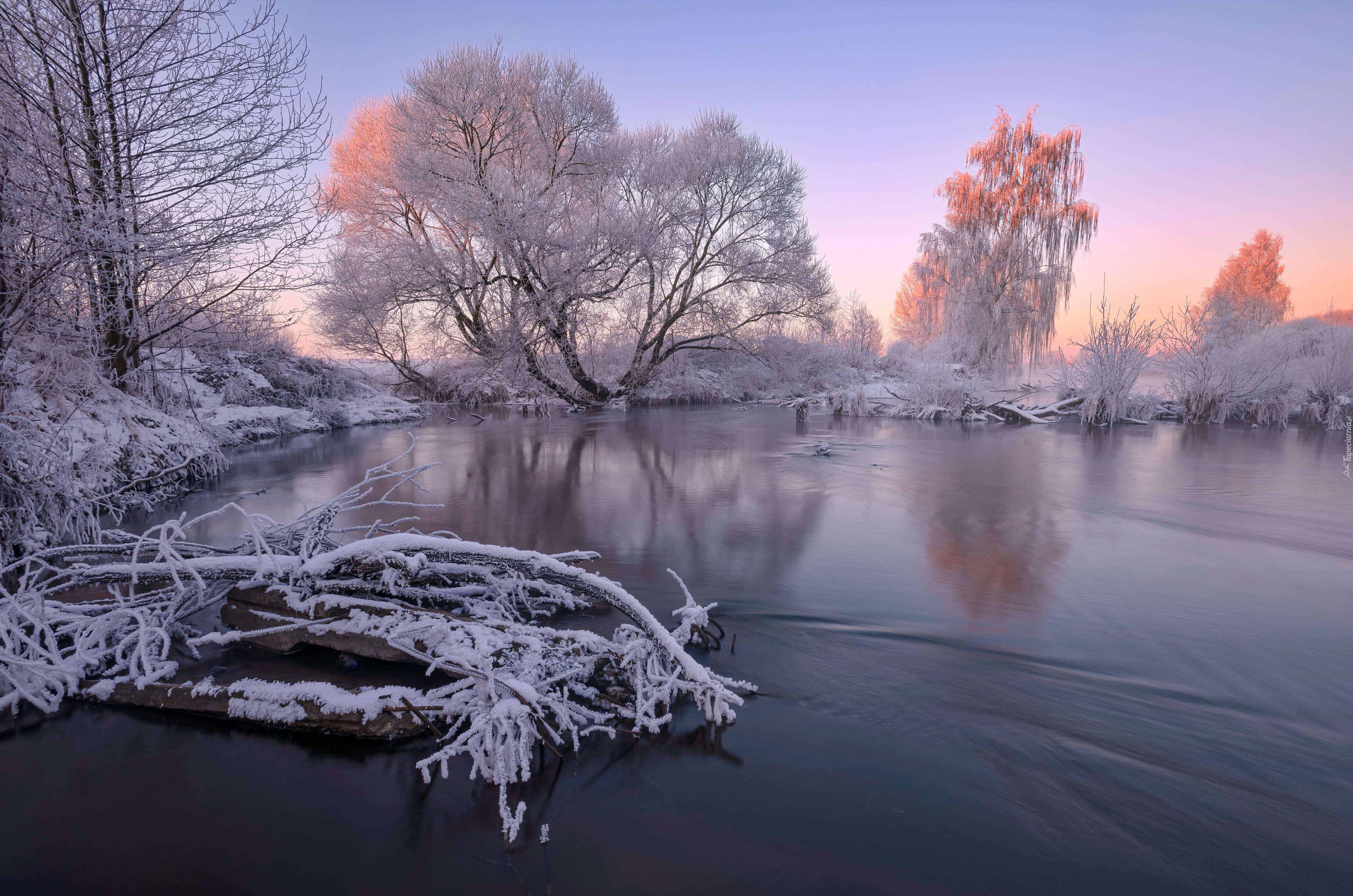 Edytor tapety: Ośnieżone krzewy i drzewa dookoła jeziora