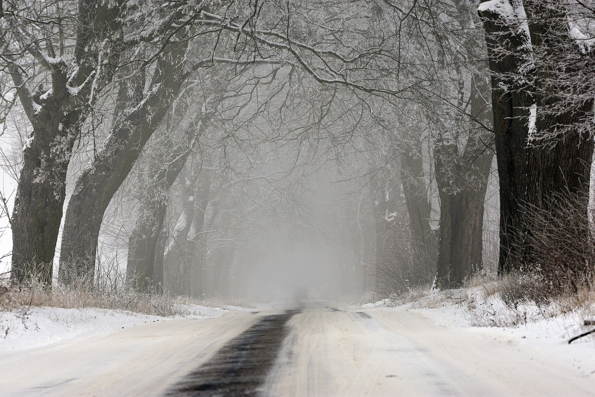 Edytor tapety: Ośnieżone drzewa wzdłuż zamglonej asfaltowej drogi
