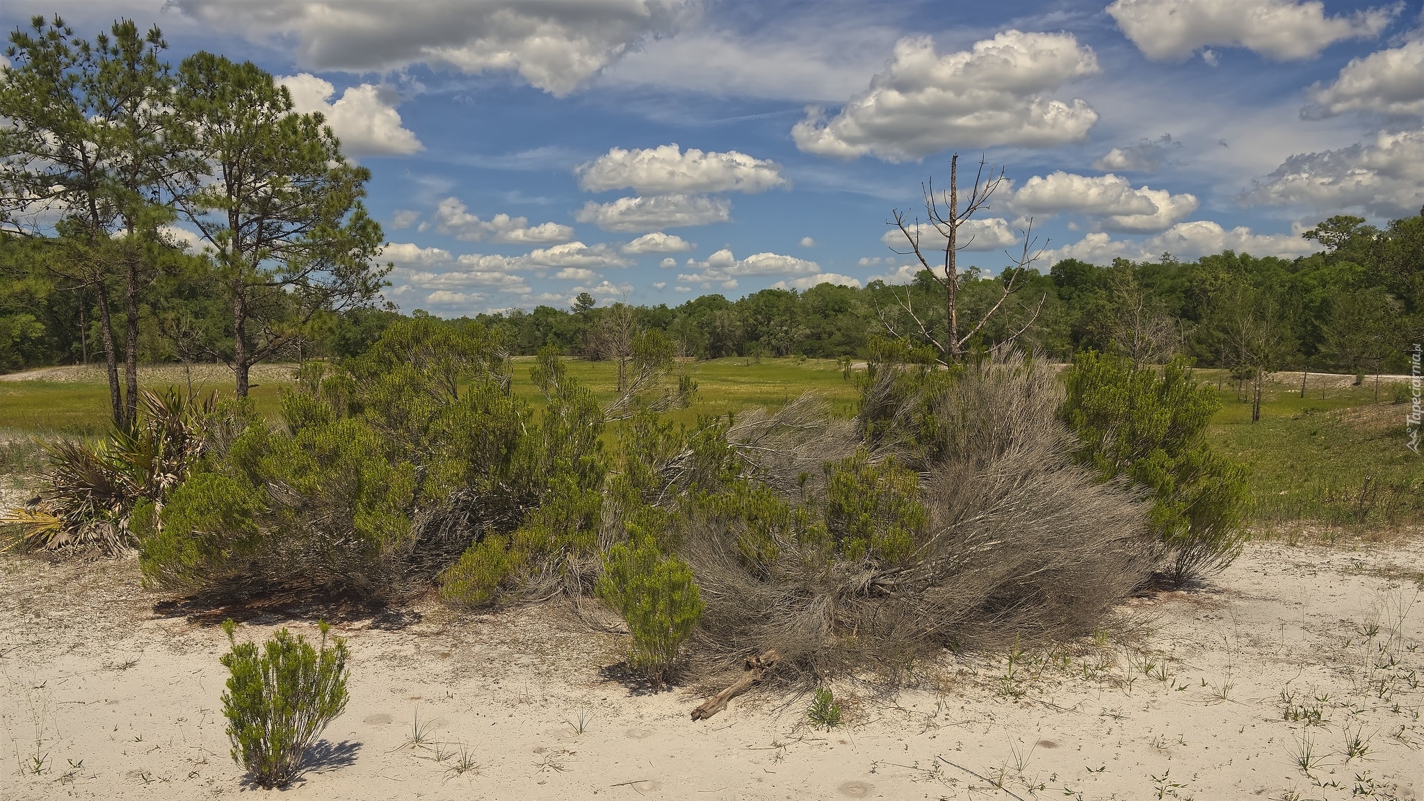 Edytor tapety: Zielone drzewa i uschnięte krzewy na piaszczystej polanie