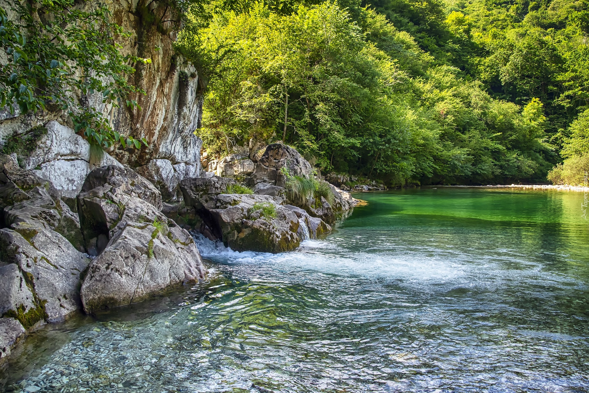 Edytor tapety: Rozświetlone drzewa i skały nad rzeką
