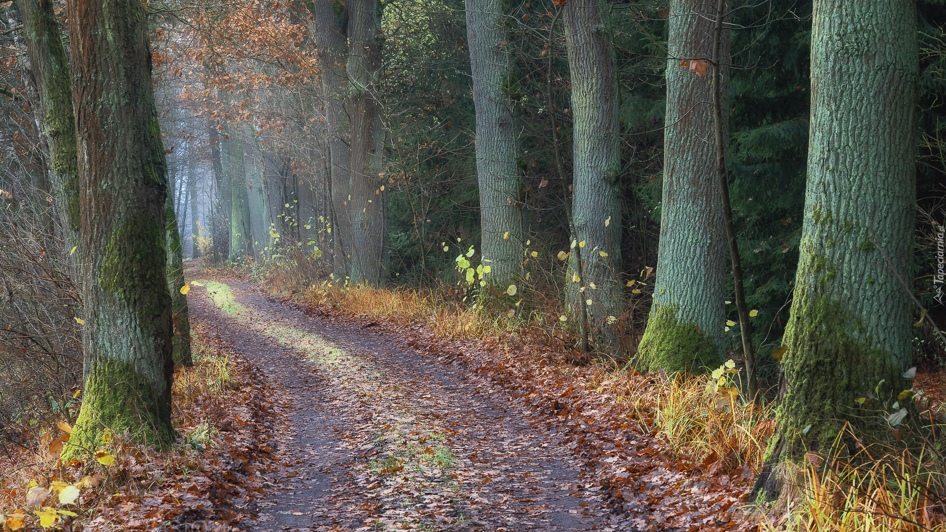 Edytor tapety: Opadłe liście i drzewa przy leśnej ścieżce