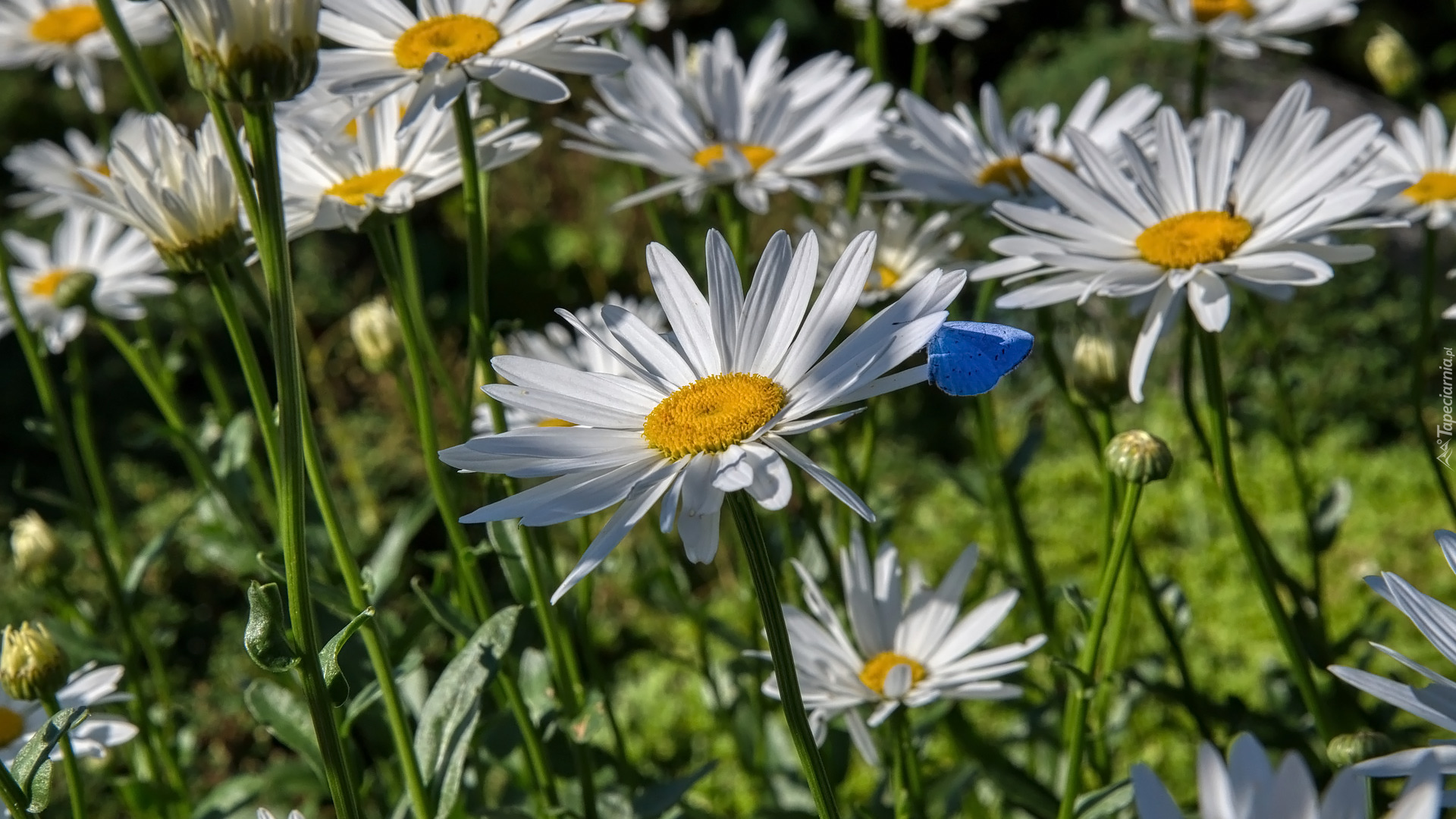 Edytor tapety: Niebieski motyl na margerytkach