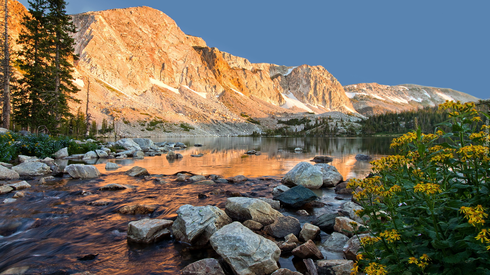 Edytor tapety: Rozświetlone słońcem góry nad jeziorem Lake Marie