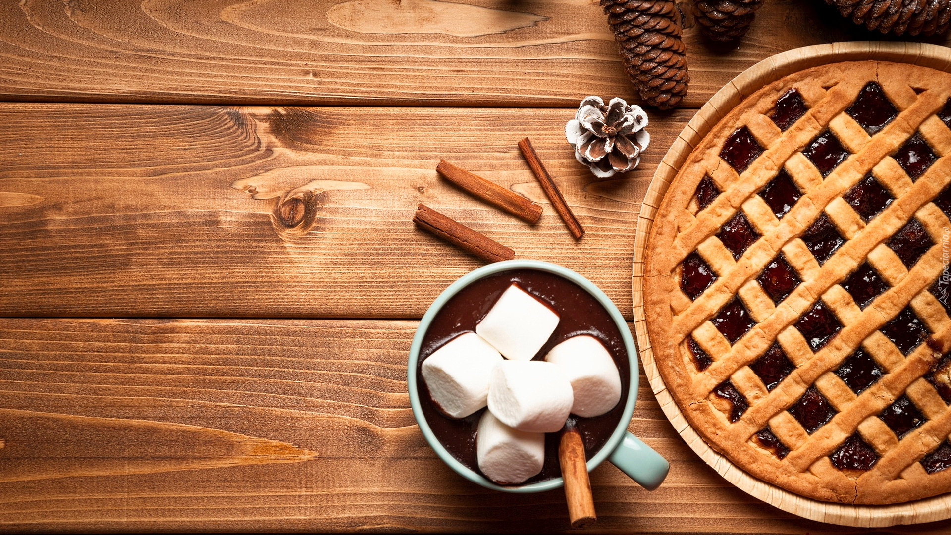 Edytor tapety: Kubek gorącej czekolady z piankami obok ciasta