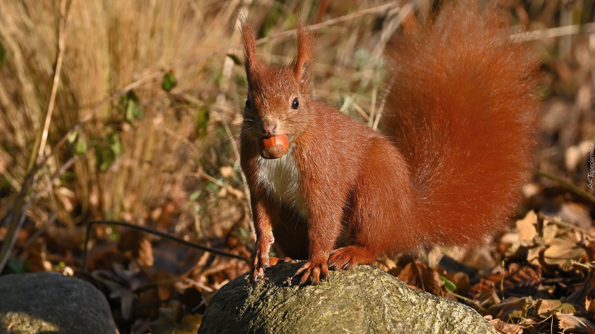 Edytor tapety: Wiewiórka na kamieniu z orzechem w pyszczku