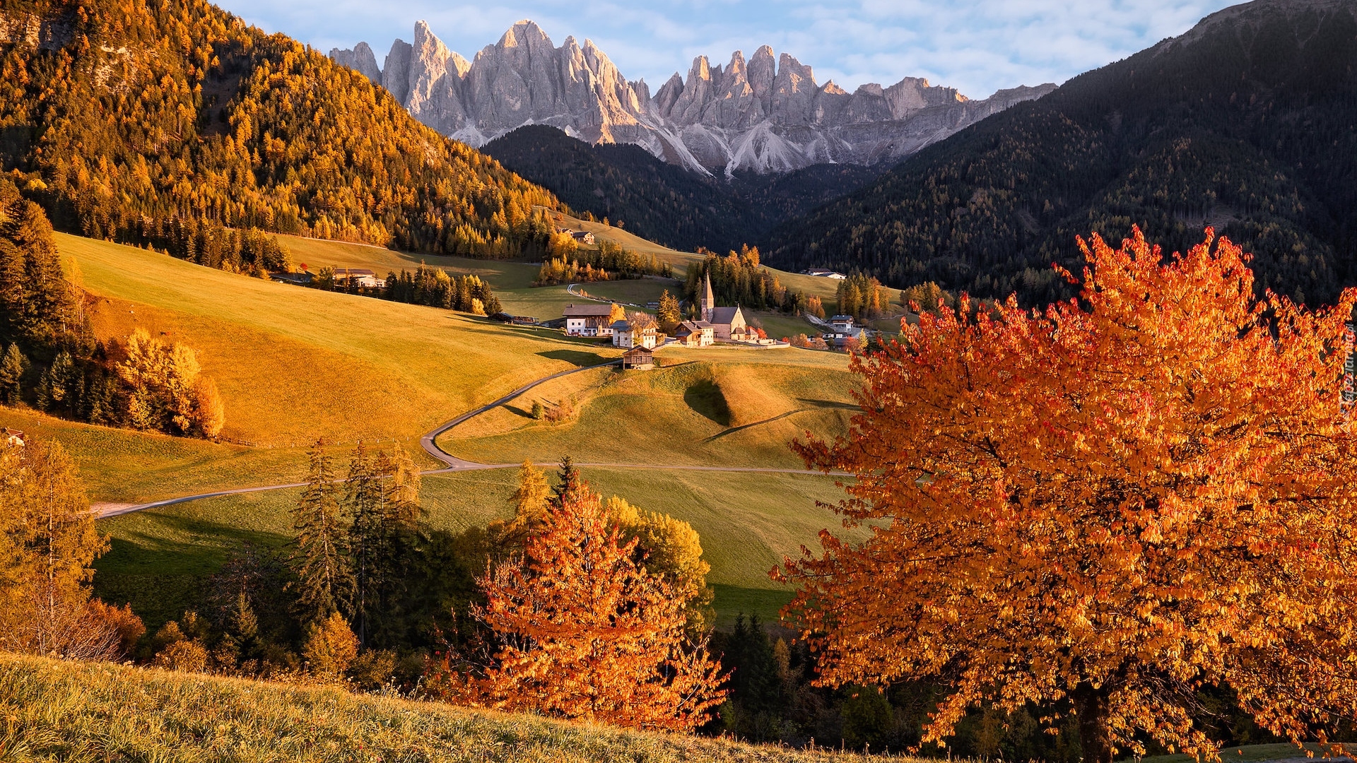 Edytor tapety: Wieś Santa Maddalena we włoskich Dolomitach jesienią