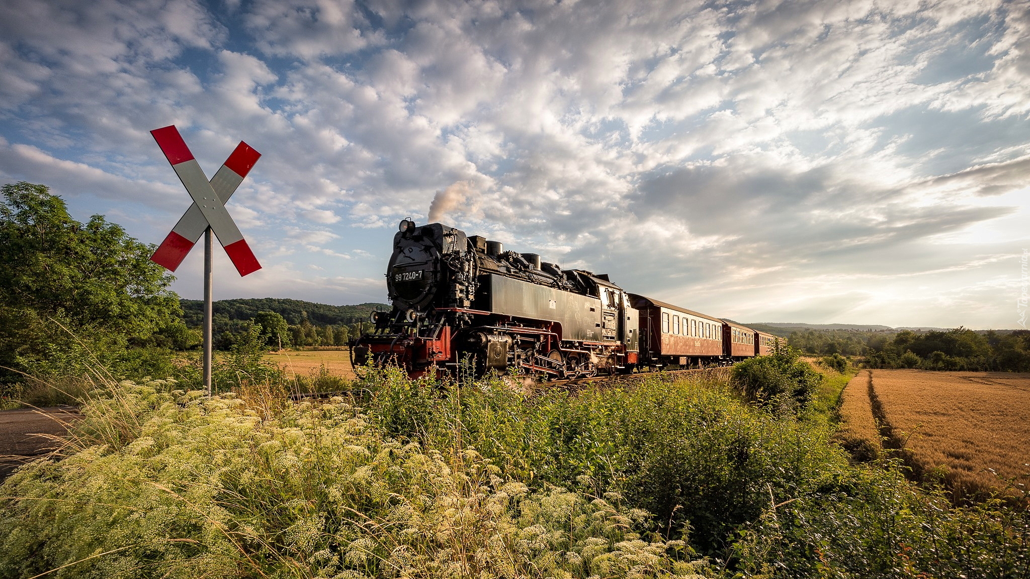 Edytor tapety: Pociąg z lokomotywą parową przed znakiem kolejowym