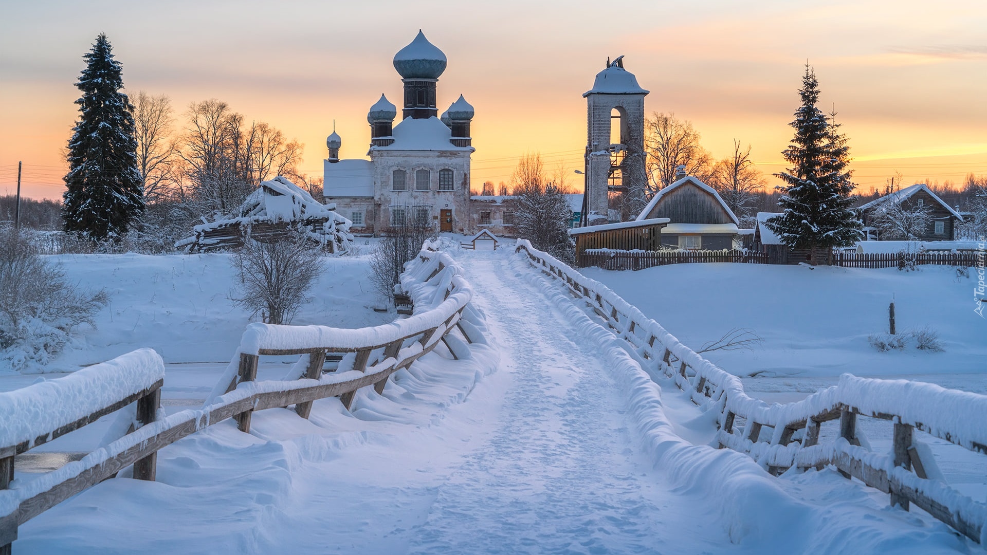 Edytor tapety: Ośnieżony most nad rzeką i cerkiew w tle