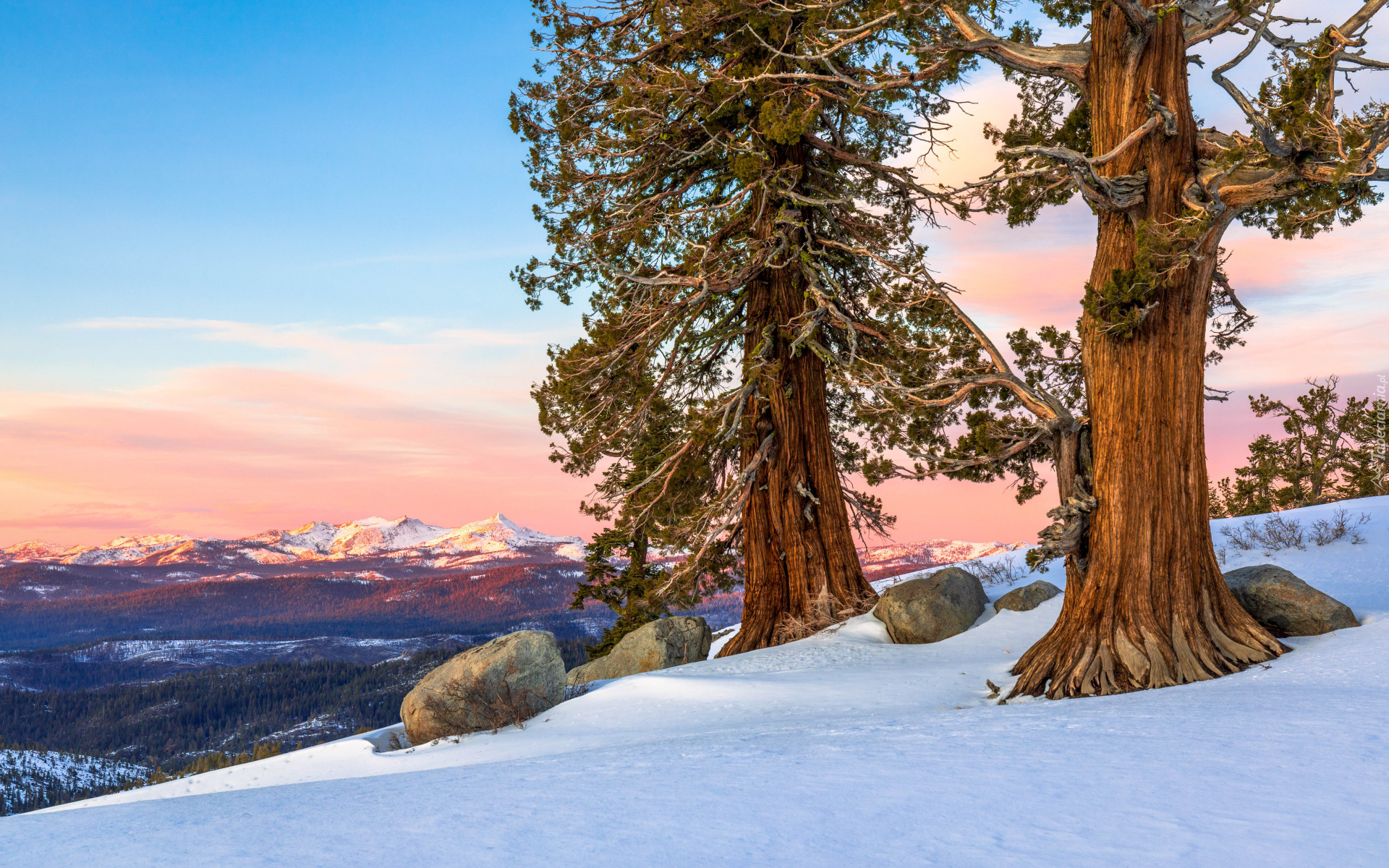 Edytor tapety: Sosny na zaśnieżonym wzgórzu