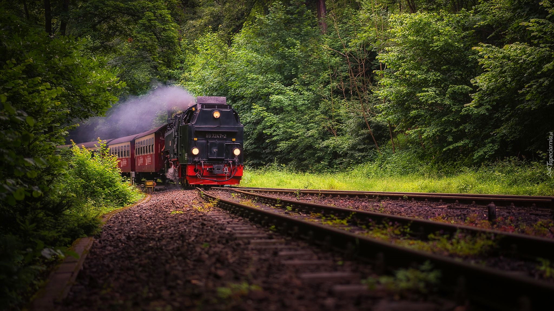 Edytor tapety: Pociąg parowy jadący przez zielony las liściasty