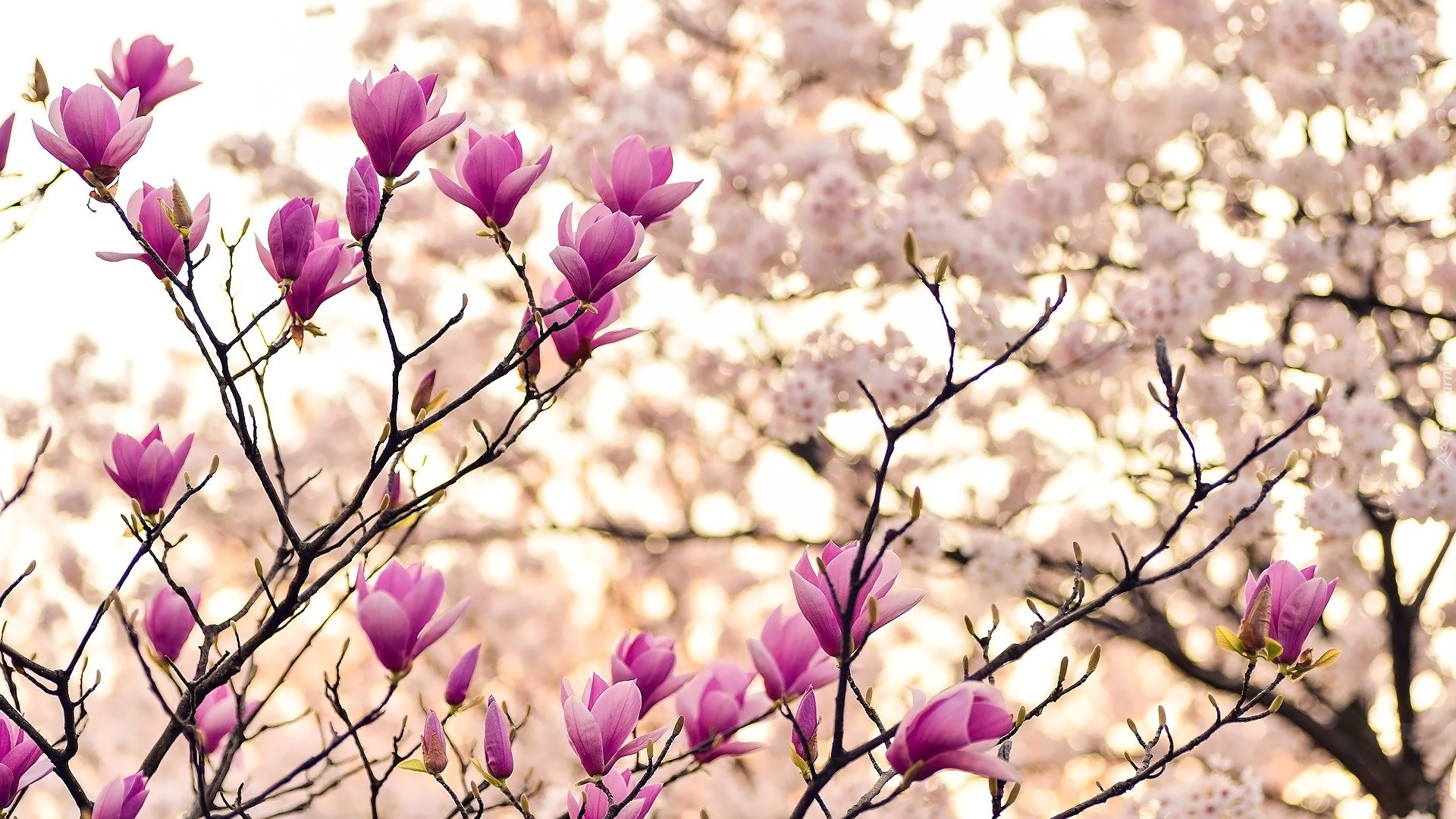 Edytor tapety: Pąki rozkwitającej różowej magnolii na gałązkach