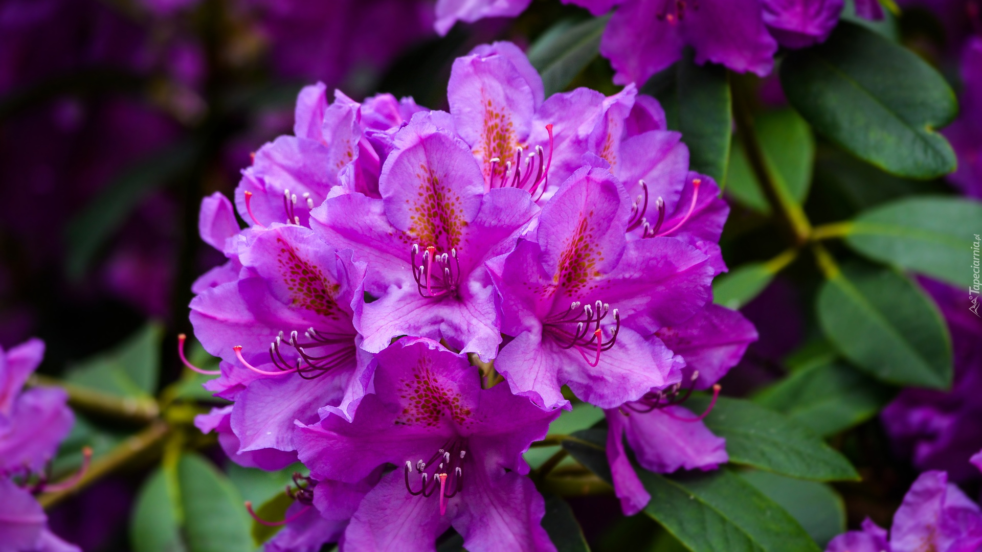Edytor tapety: Fioletowe kwiaty rododendronu z liśćmi