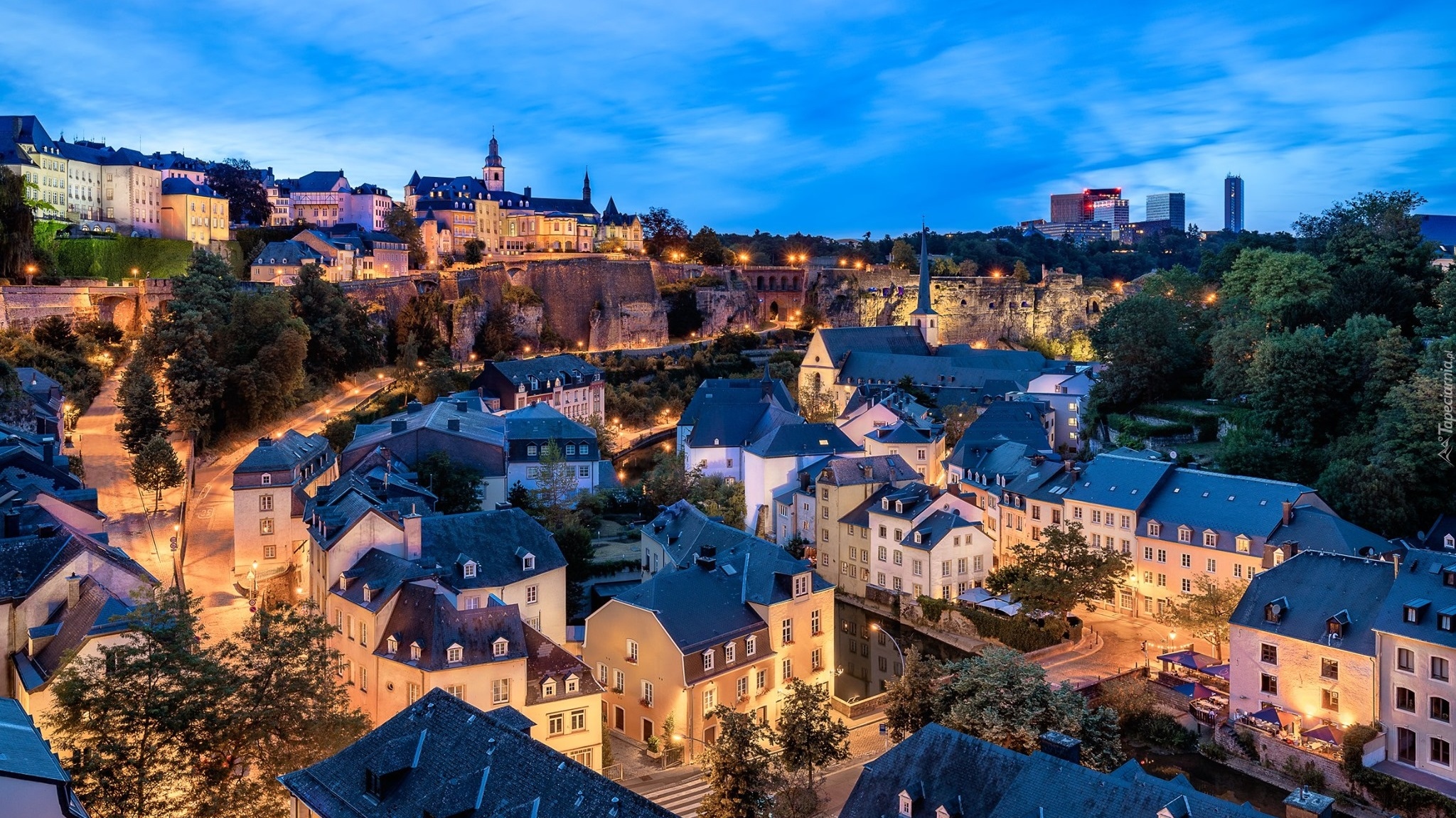 Edytor tapety: Oświetlone domy w Luksemburgu