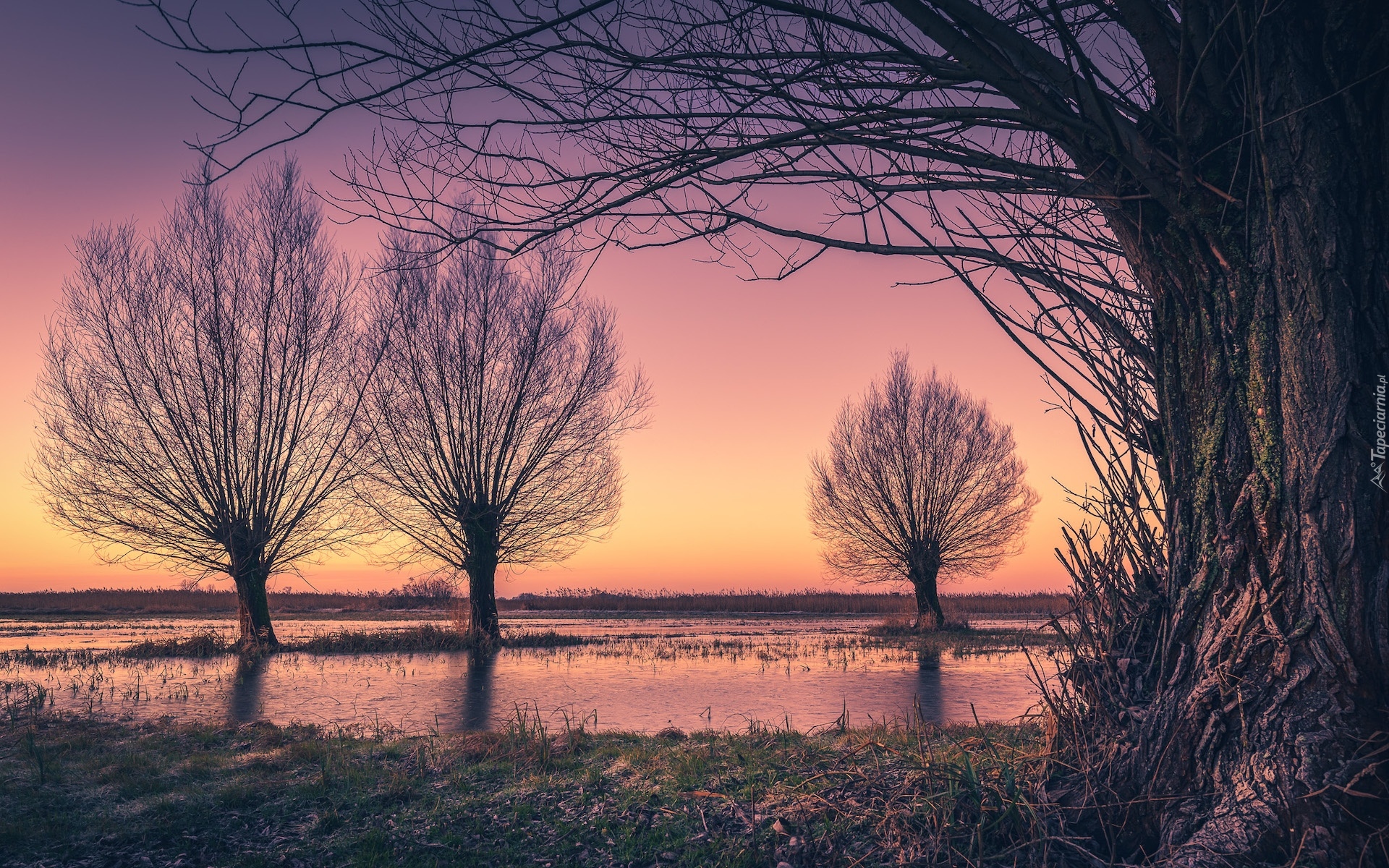 Edytor tapety: Bezlistne drzewa na rozlewisku rzeki