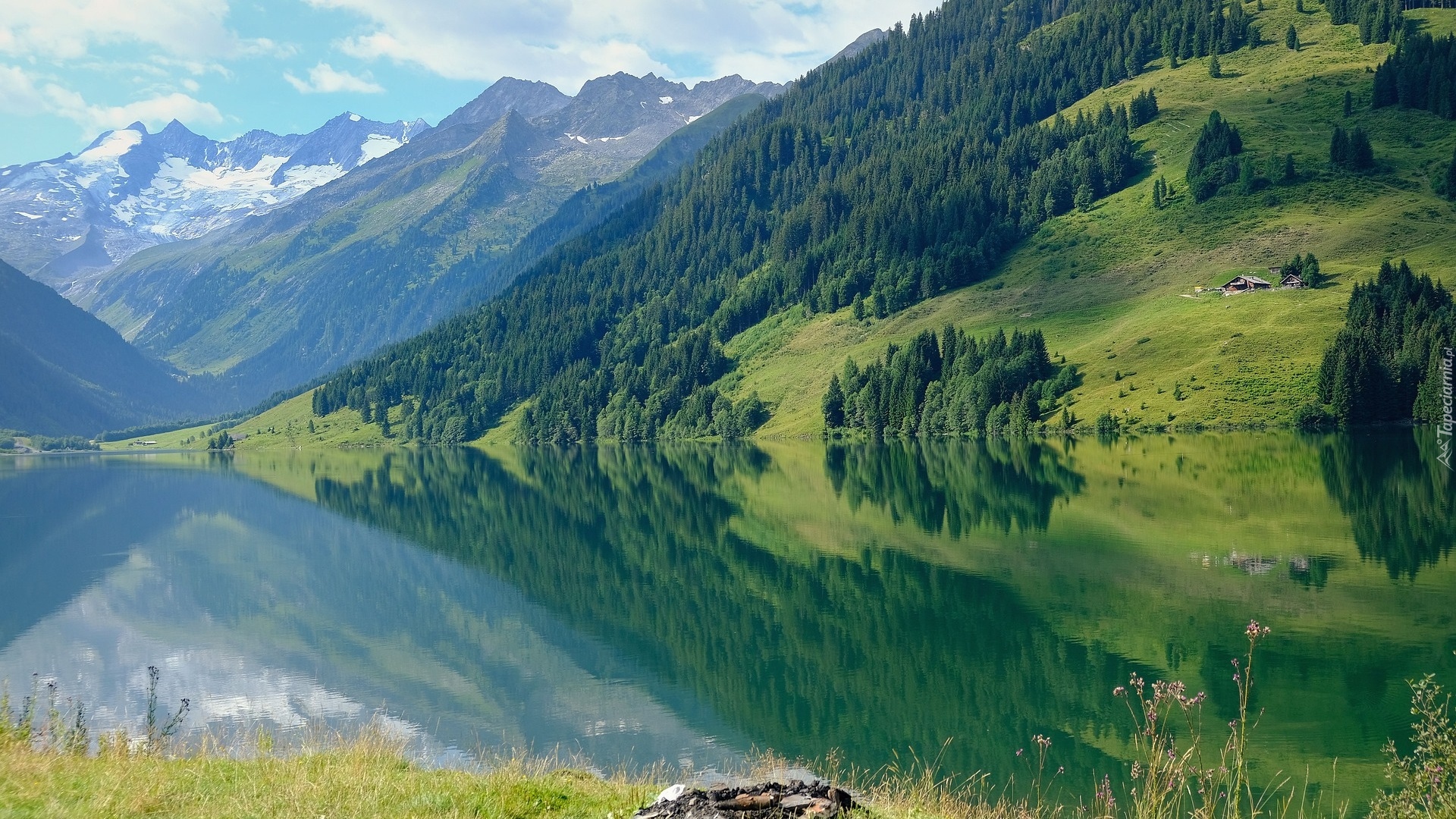 Edytor tapety: Odbicie zalesionych wzgórz i gór w jeziorze